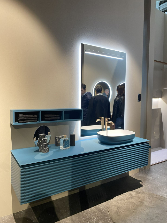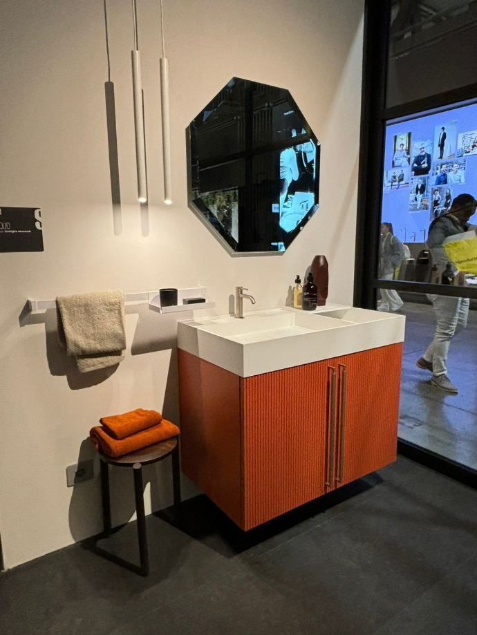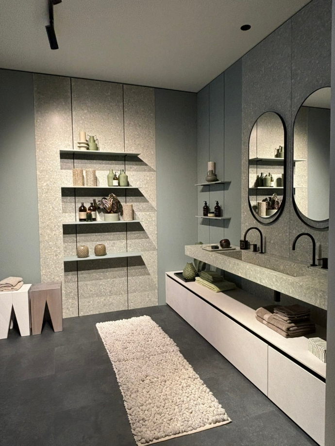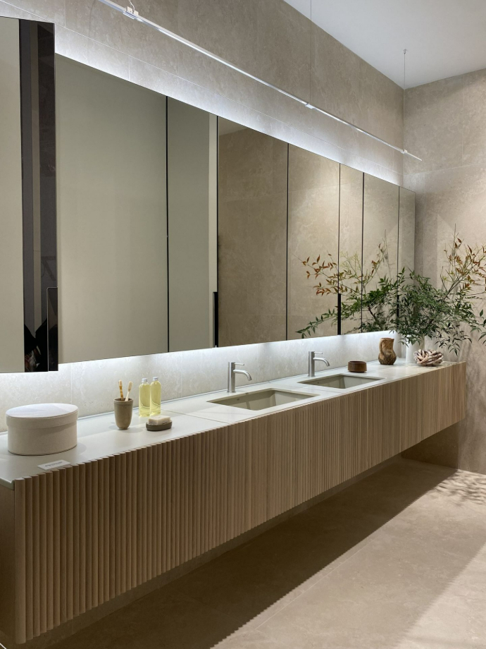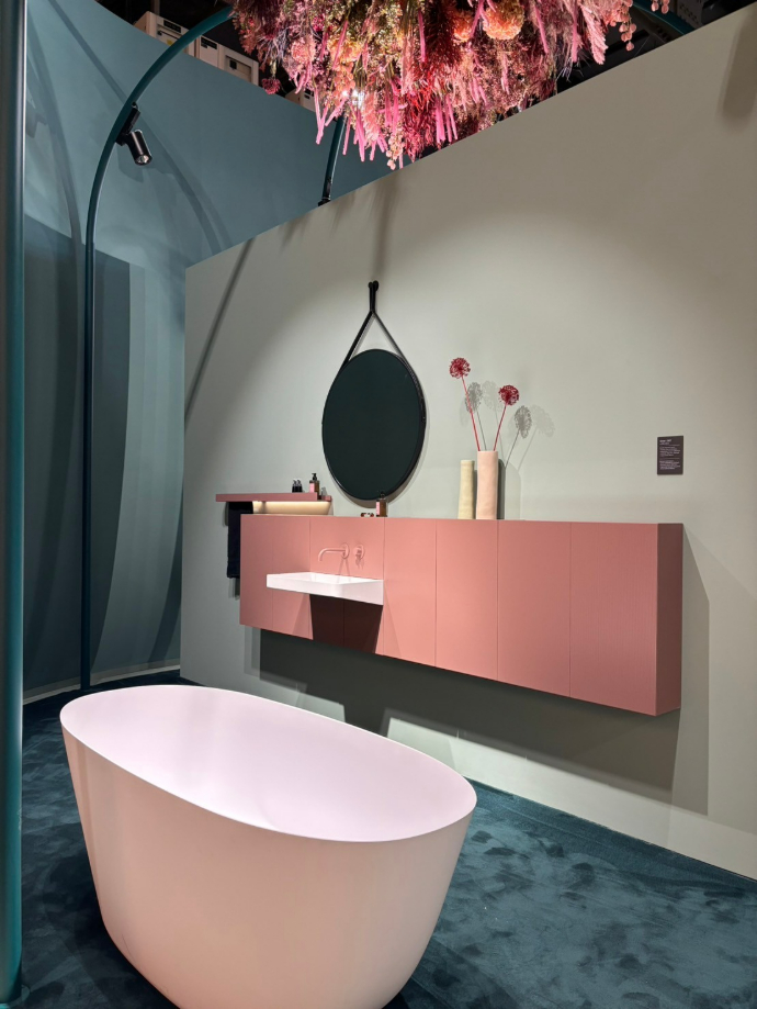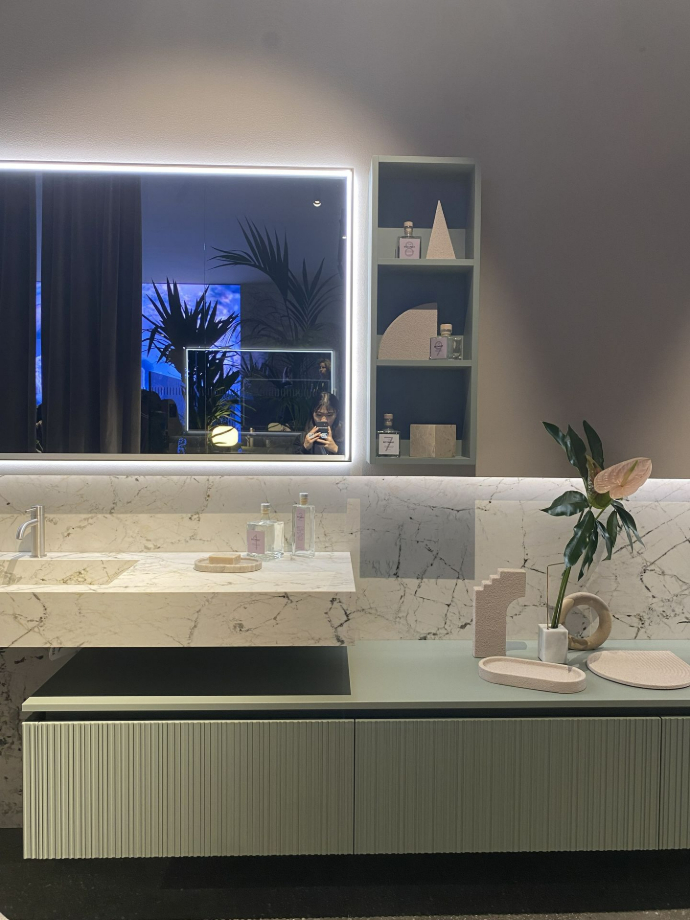 過往我們對浴櫃的印象,往往是白色、木紋、低調實用。但在這裡,設計師們用非常大膽的方式,重新定義了「浴櫃」在空間中的角色——它不再只是功能性的配角,而是整體浴室氛圍的主角之一。