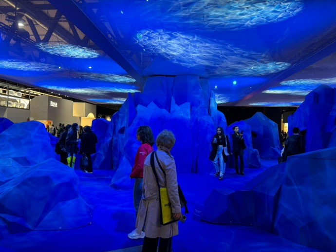 以深邃藍色打造出宛如海底的沉浸空間,天花與牆面投射光影交錯,營造水波流動的氛圍。觀者在其中移動,如同置身海洋秘境,感受強烈的感官衝擊與探索樂趣。