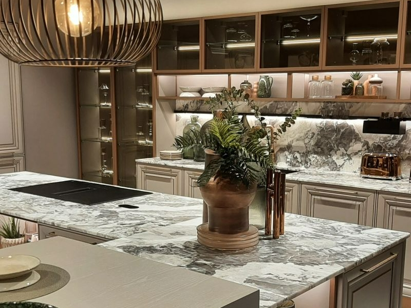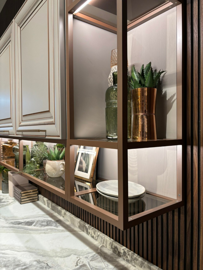 柔和的玫瑰金線條勾勒櫃體輪廓,搭配細膩的大理石紋理檯面,讓空間在奢華與典雅之間取得完美平衡。光影映襯下的金屬光澤與石材肌理相互呼應,營造出溫潤卻不失高貴的氛圍,展現獨特的現代精品廚房美學。