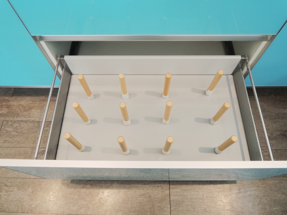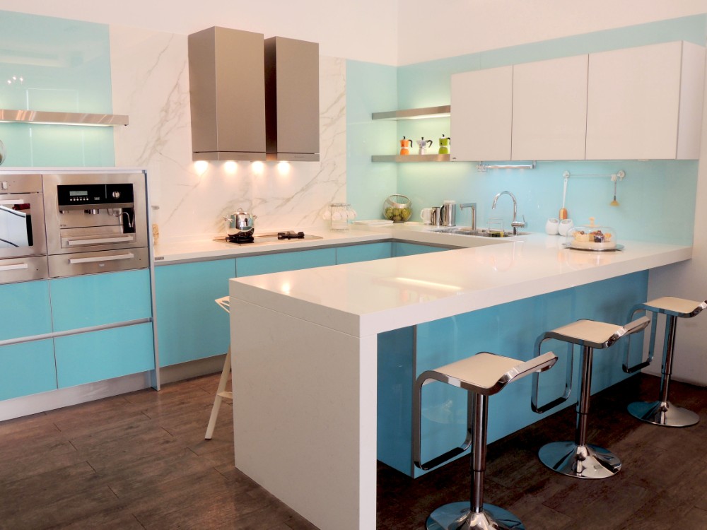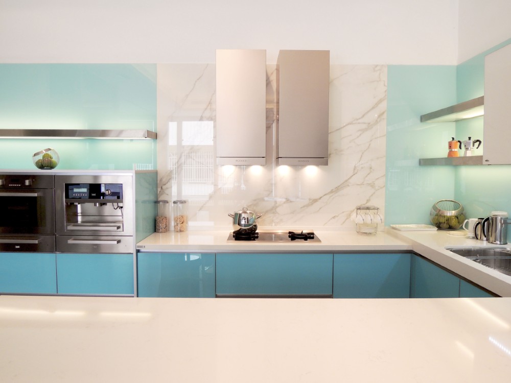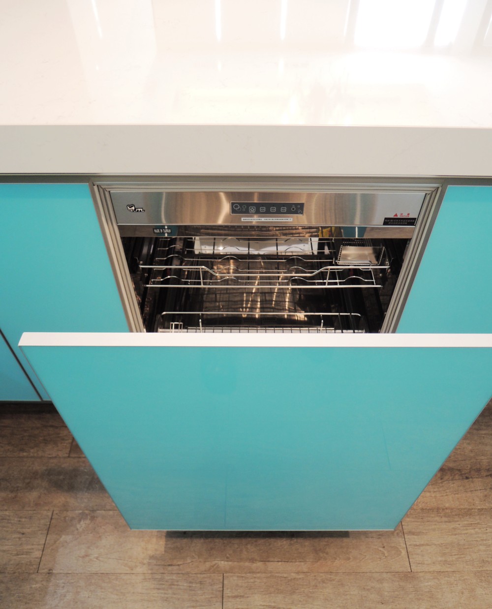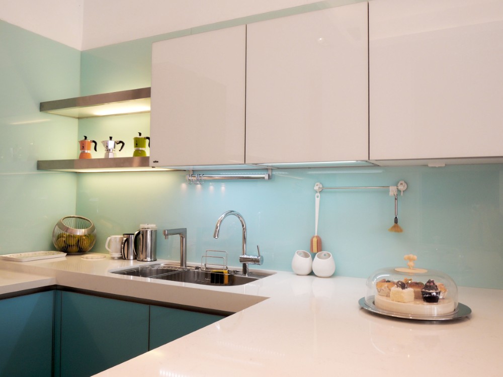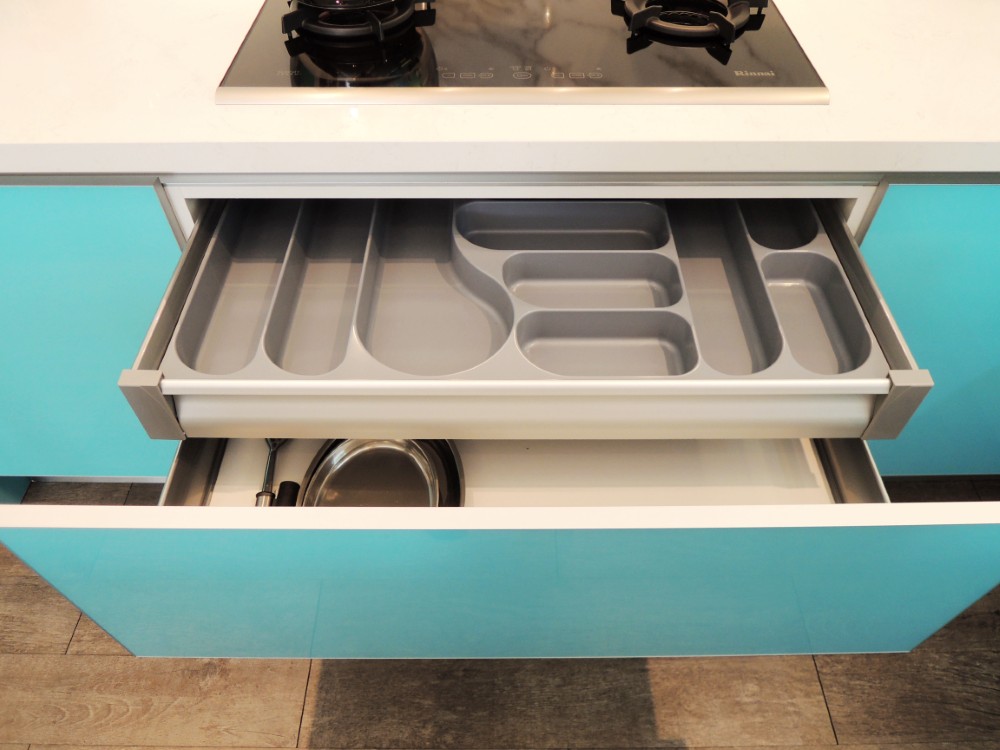 這套以淺藍色系的玻璃門板為主題,雖然設計看似簡約,但在製作過程中卻極為講究,尤其是玻璃門板的選擇與處理,因其尺寸與傳統板材有所不同,無論是精度還是比例,都需要細緻的把握與精湛的工藝。