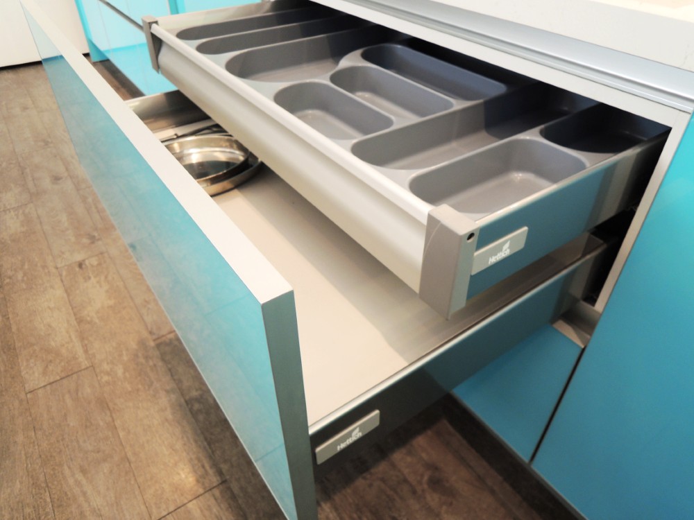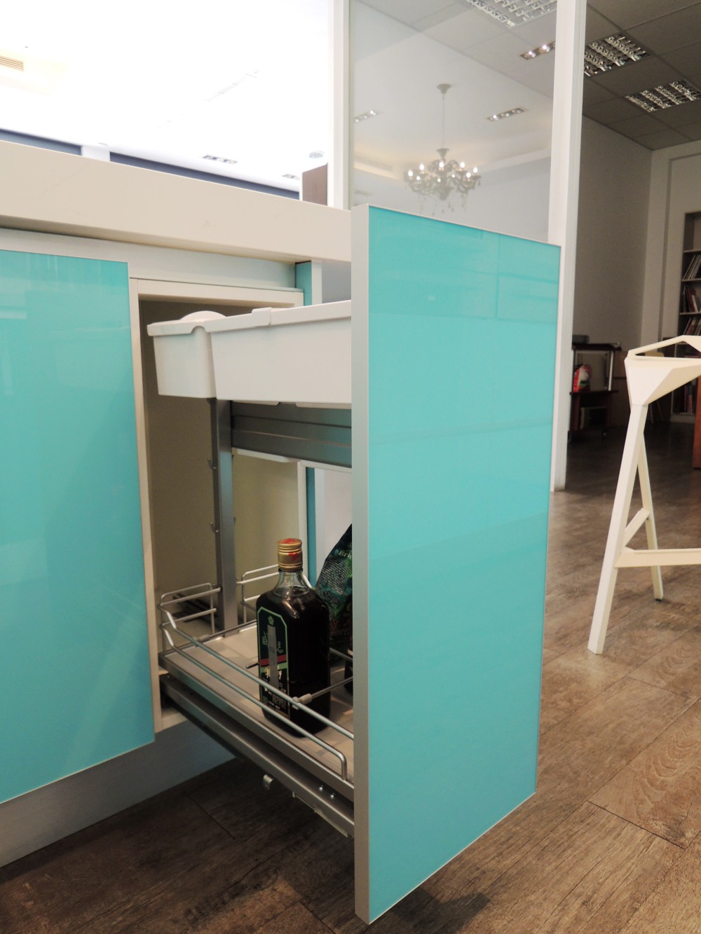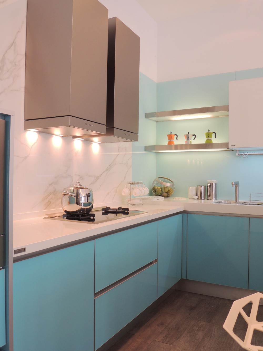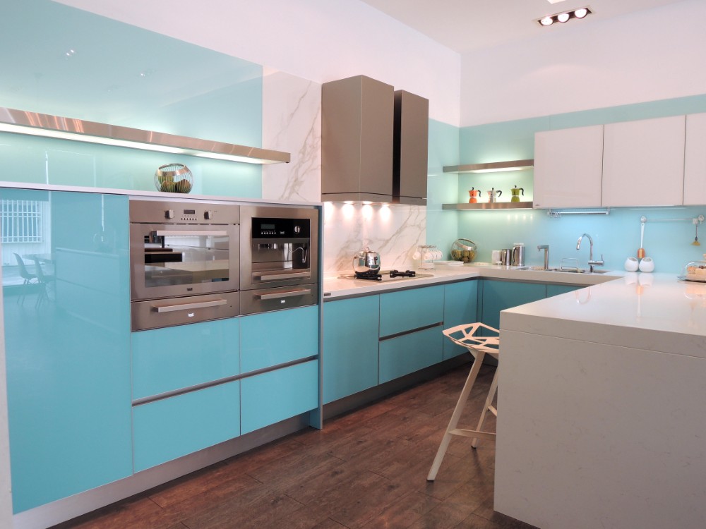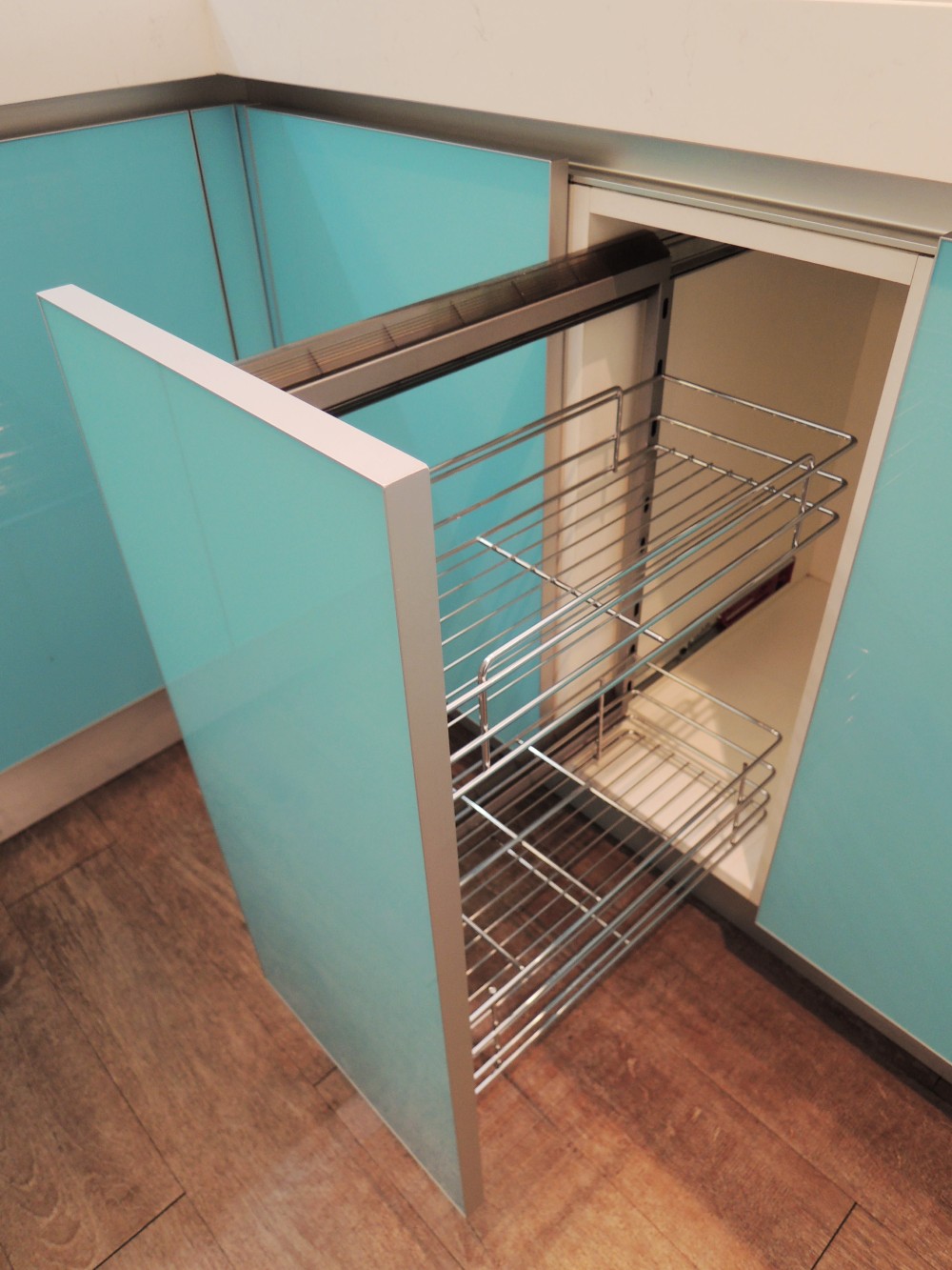 這套以淺藍色系的玻璃門板為主題,雖然設計看似簡約,但在製作過程中卻極為講究,尤其是玻璃門板的選擇與處理,因其尺寸與傳統板材有所不同,無論是精度還是比例,都需要細緻的把握與精湛的工藝。
