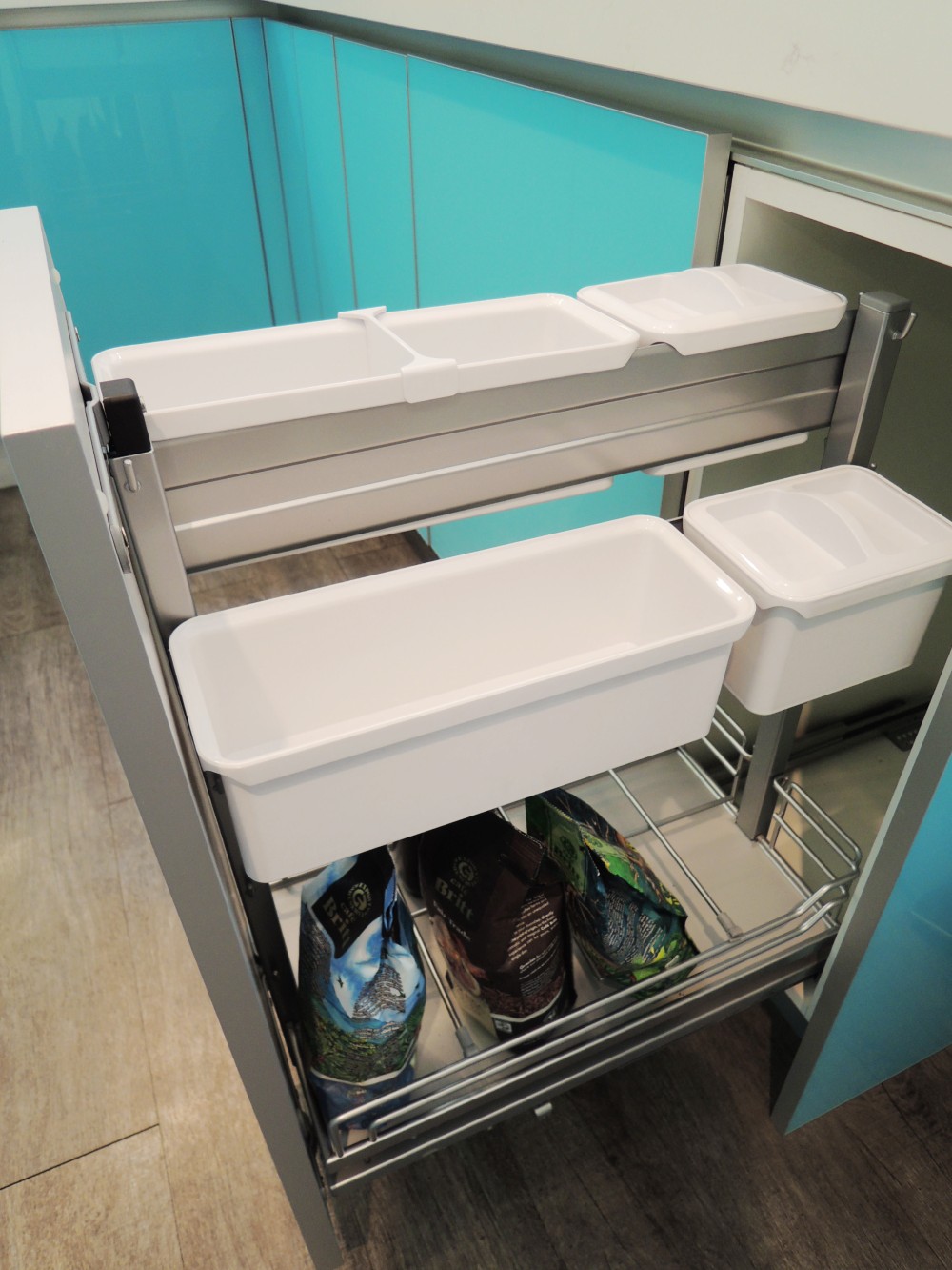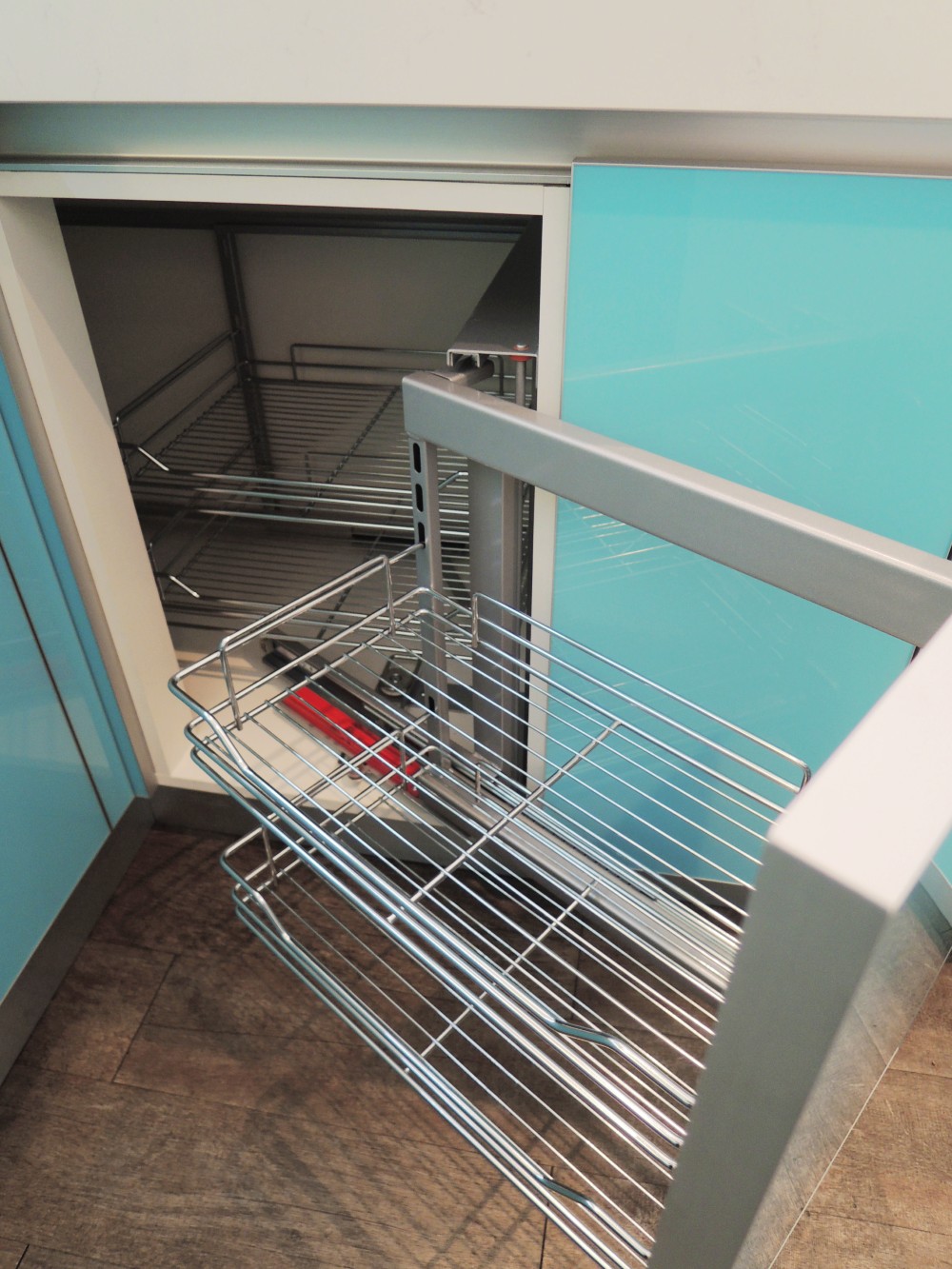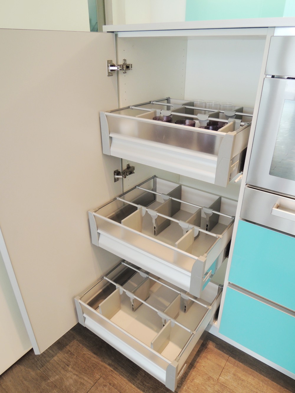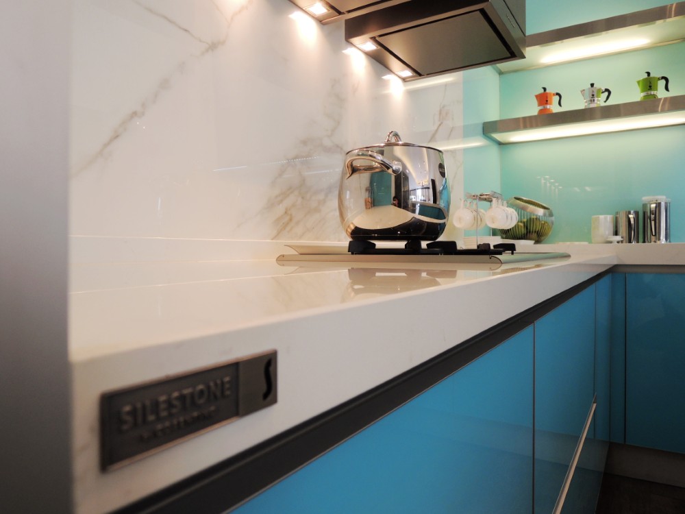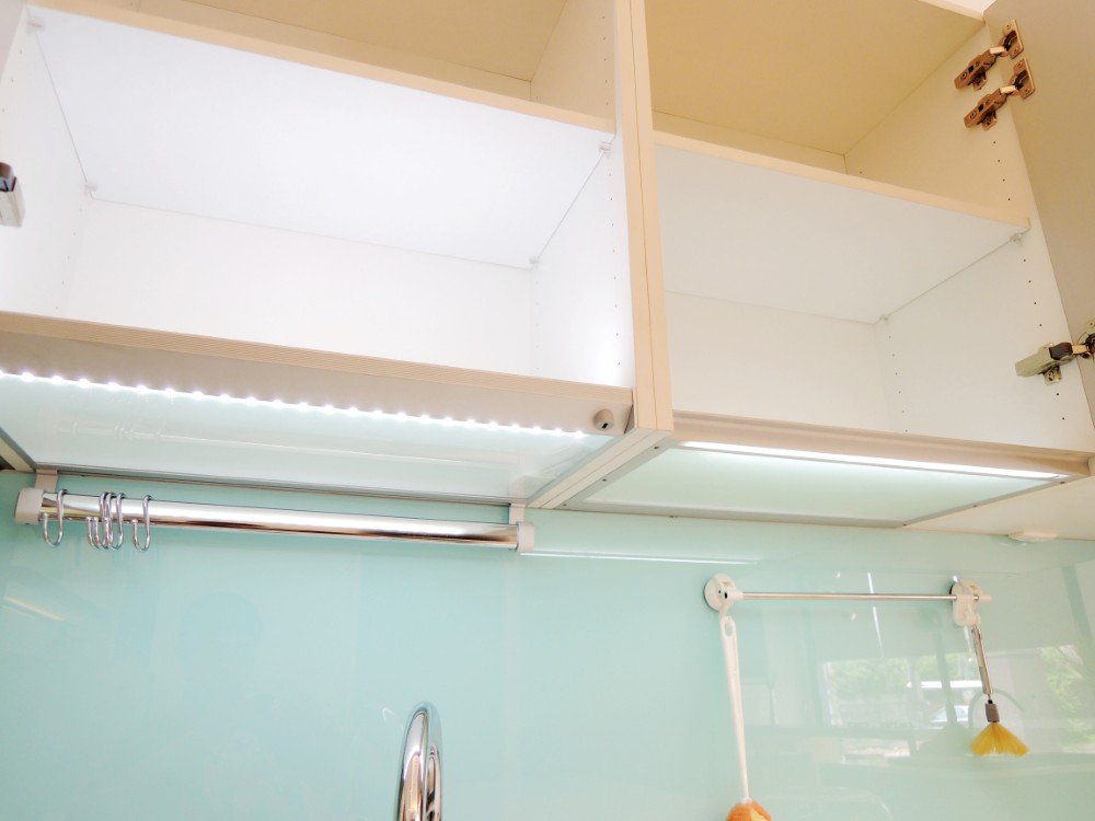 這套以淺藍色系的玻璃門板為主題,雖然設計看似簡約,但在製作過程中卻極為講究,尤其是玻璃門板的選擇與處理,因其尺寸與傳統板材有所不同,無論是精度還是比例,都需要細緻的把握與精湛的工藝。