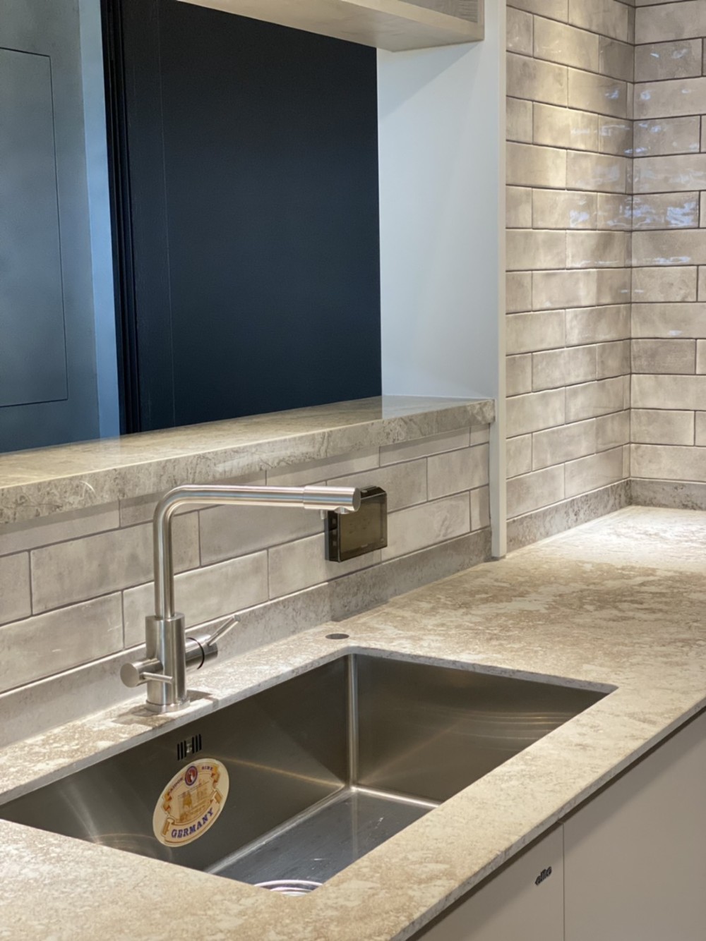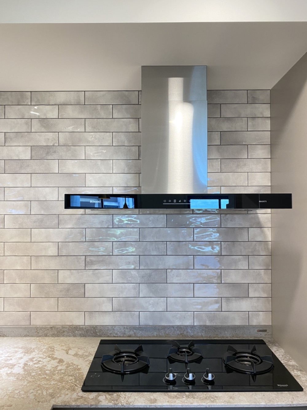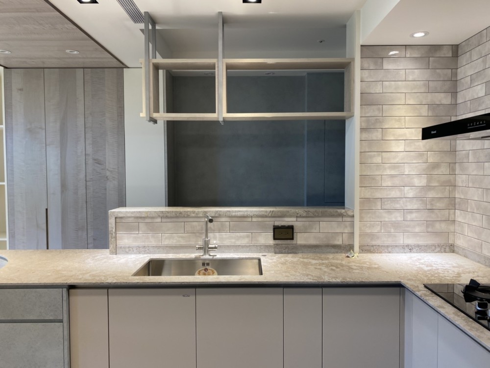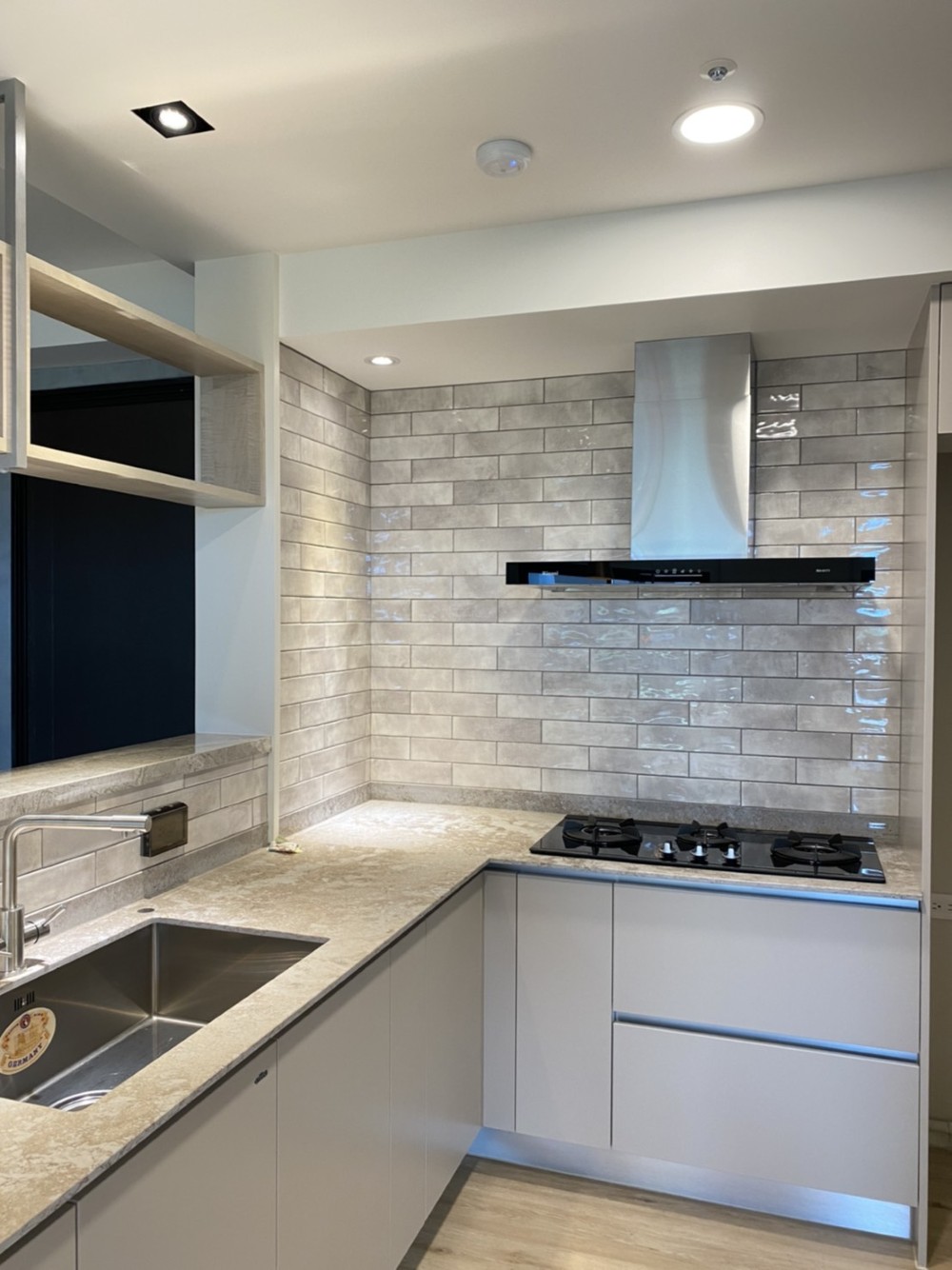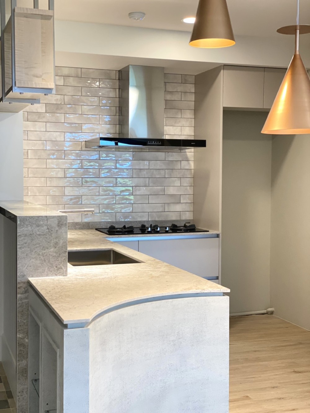 仿舊的復古檯面特別設計了圓弧形狀,增添了流暢感與柔和的視覺效果。牆面使用灰系磚牆,細緻的光澤感使整個空間顯得更加寬敞與明亮。整體色調以灰色、淺灰色和灰白色為主,簡約卻不失時尚感,讓廚房呈現出一種既耐看的設計風格,又能輕鬆搭配各種居家擺飾,營造出雅緻的生活氛圍。