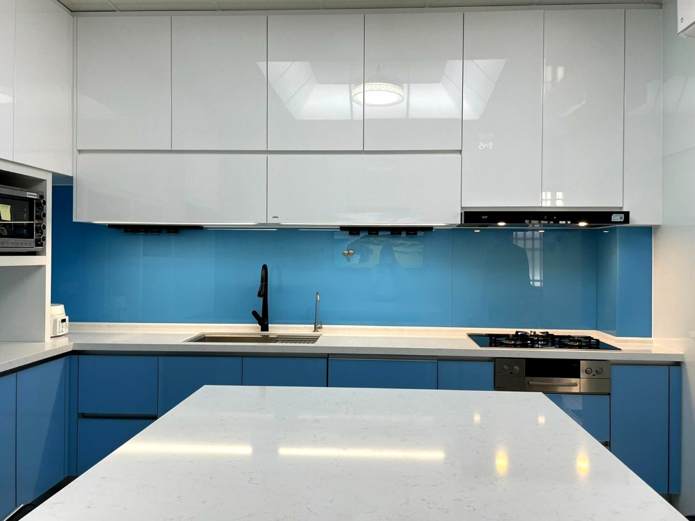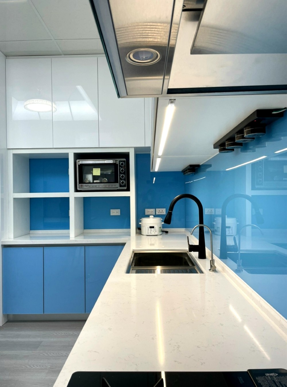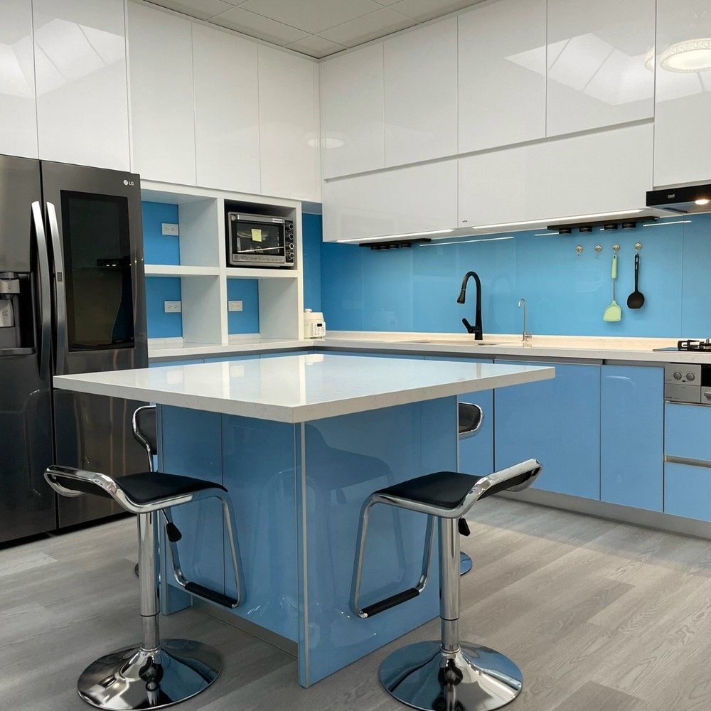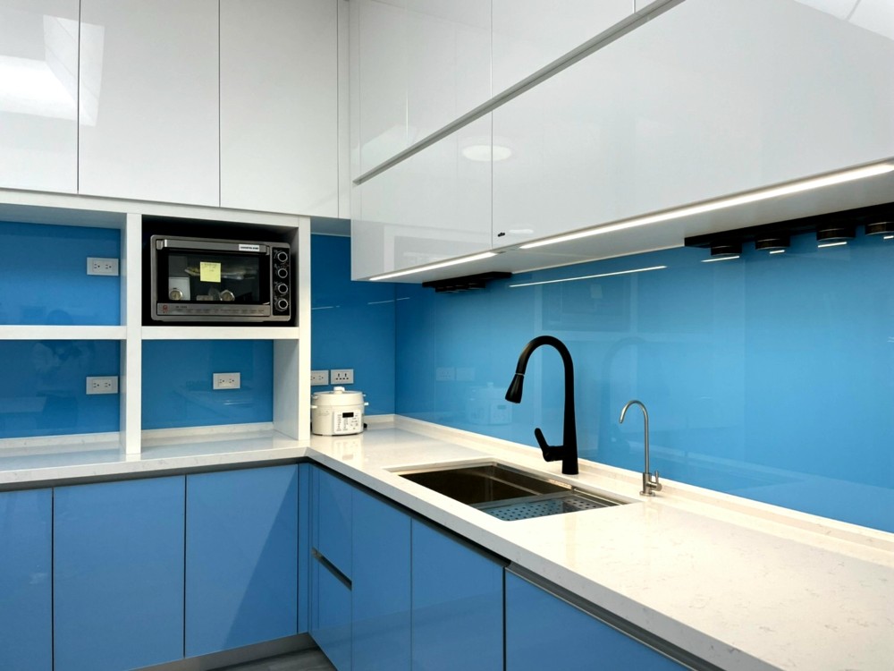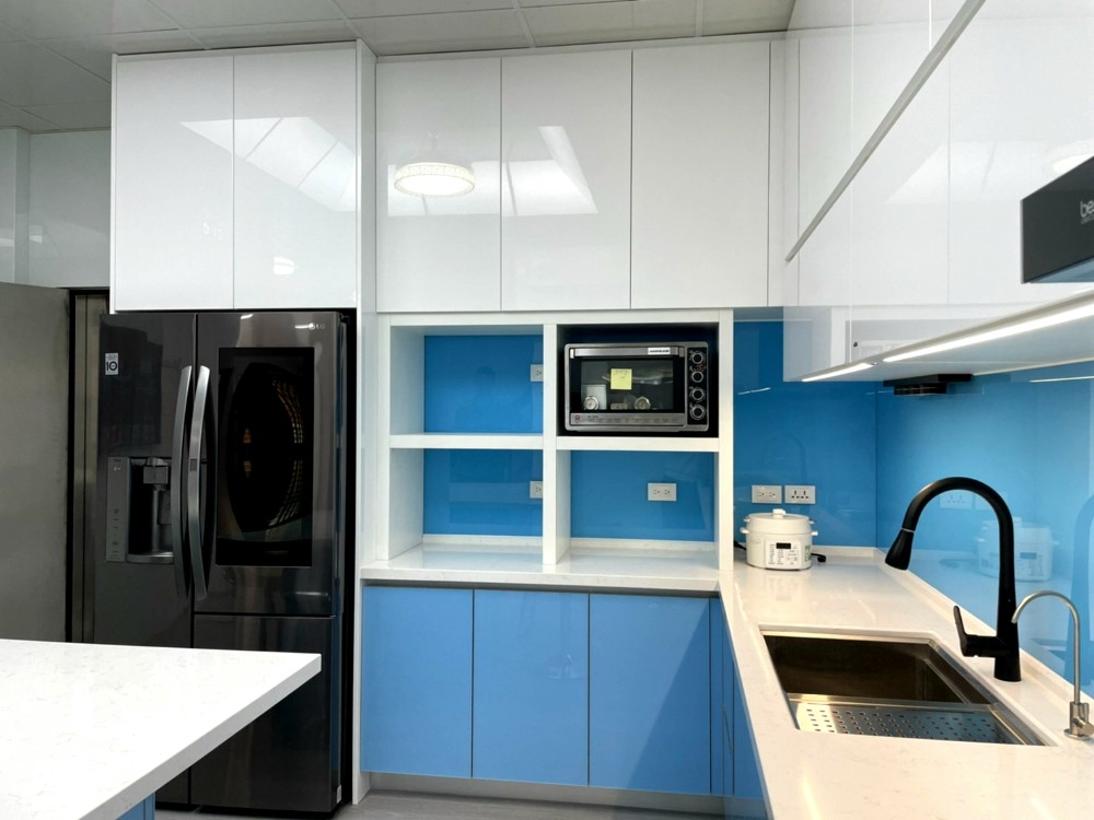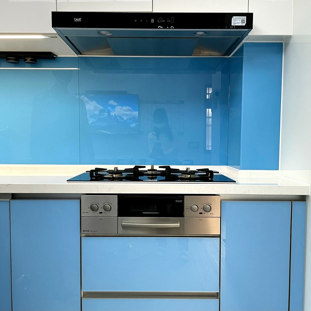 清新如天空般的藍色,讓整個廚房空間在色彩的映襯下顯得格外亮眼與寬闊。整體色系以藍、黑、白為主,清爽潔簡不單調,完美呈現出精心設計過的和諧感。這種色彩搭配不僅視覺上令人感到舒適,使廚房空間無論從設計或實用性上,都散發出高雅的品味。