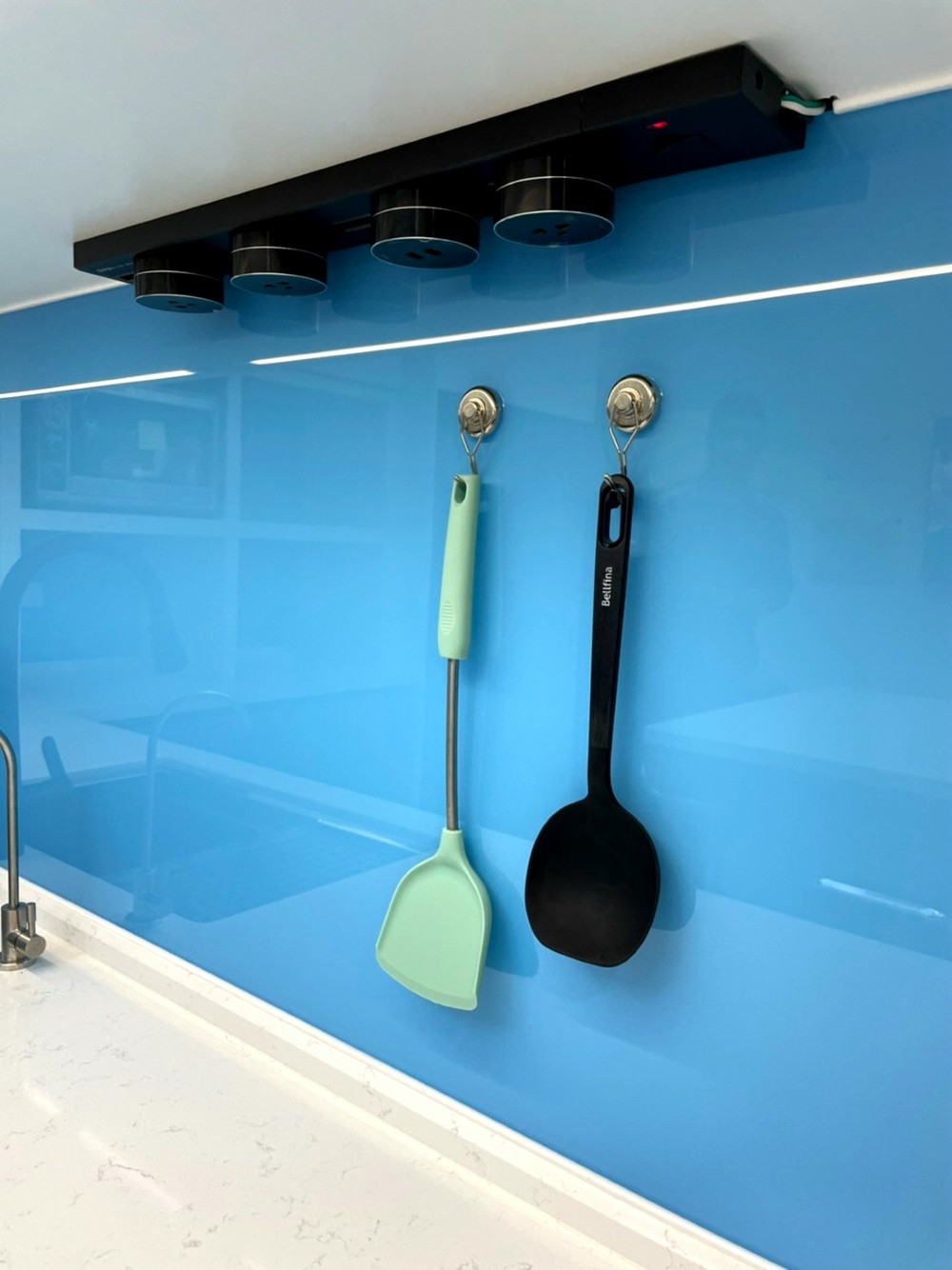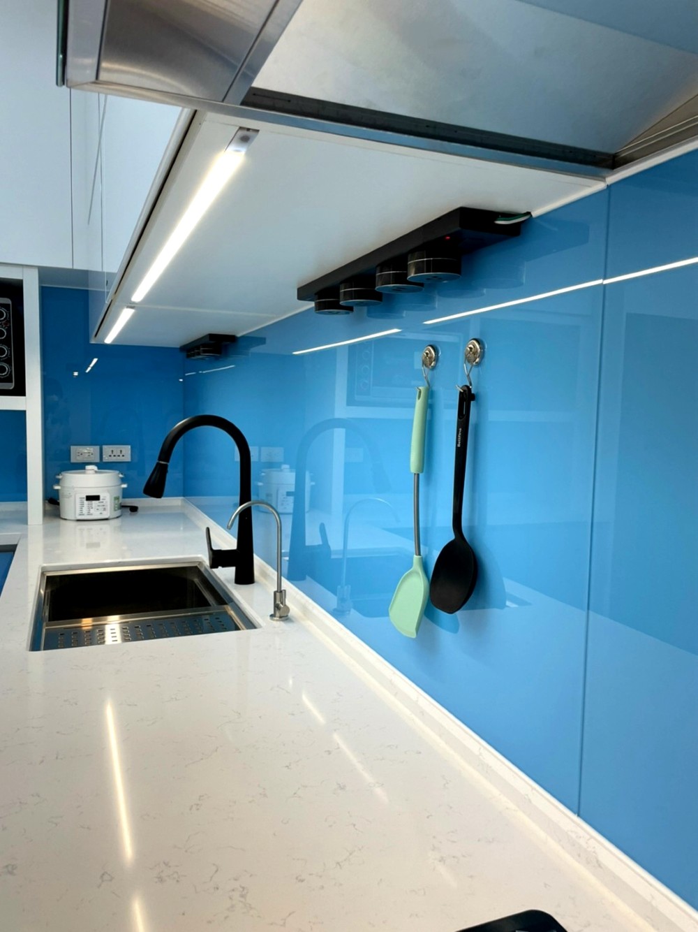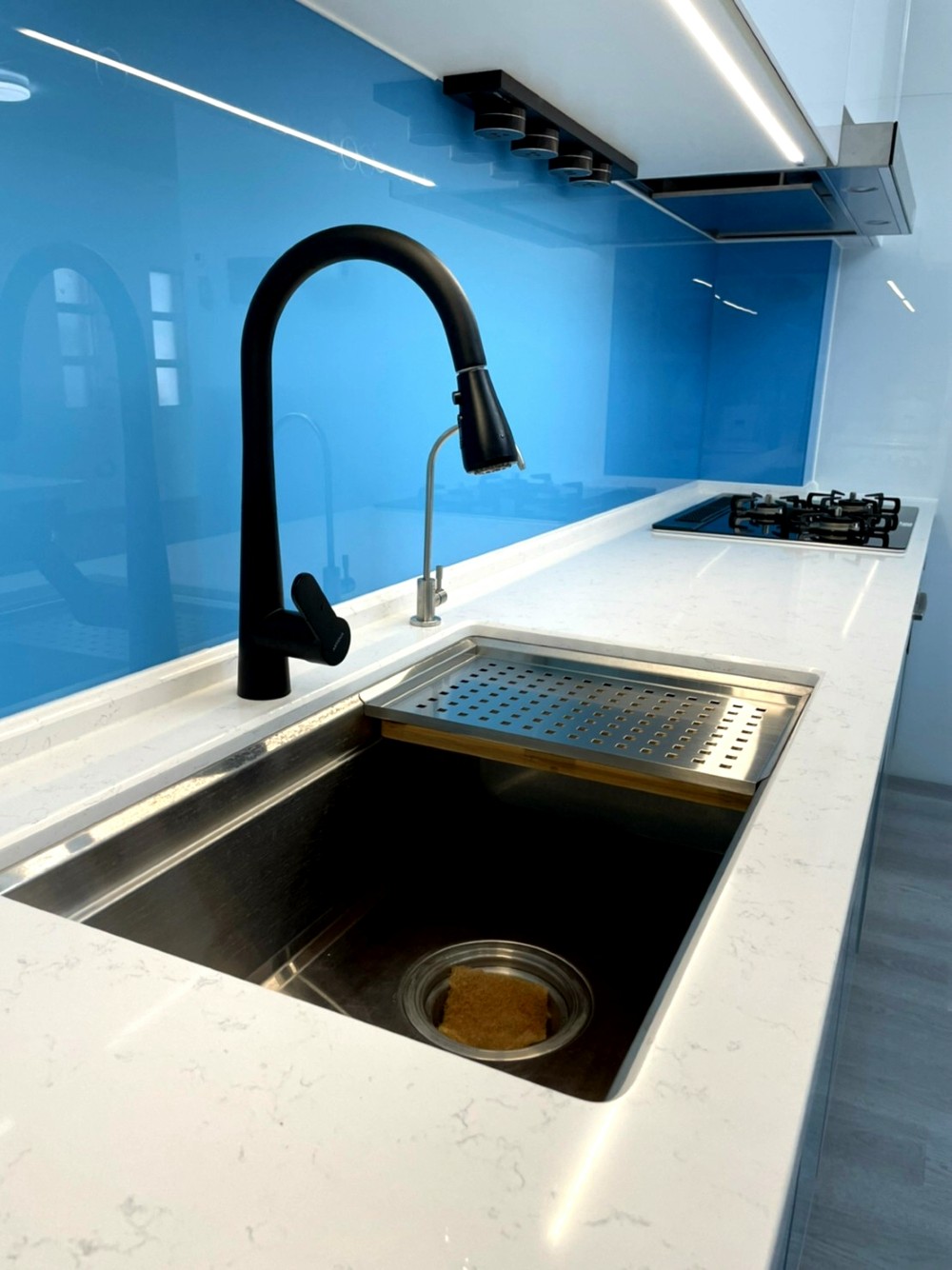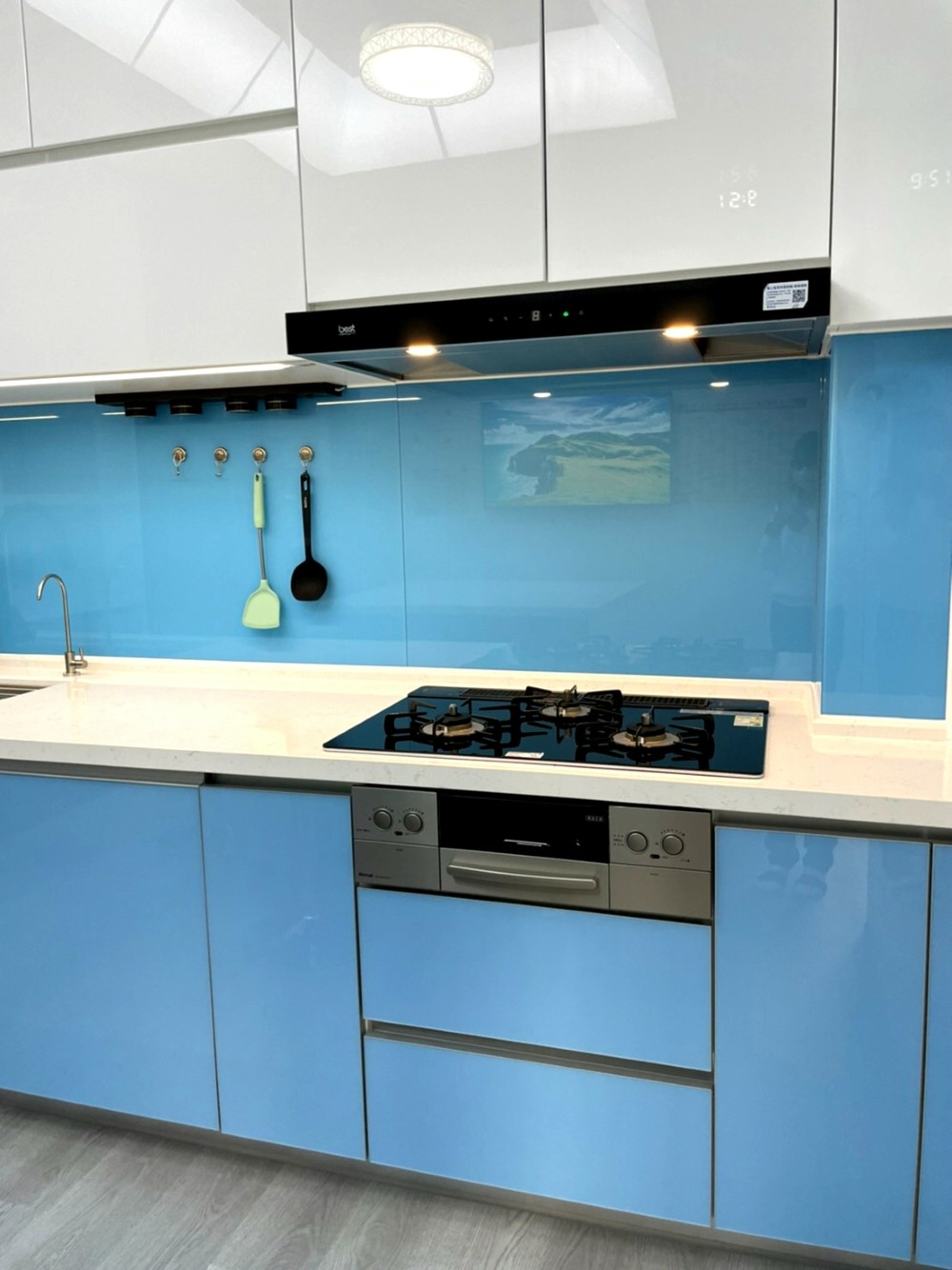 清新如天空般的藍色,讓整個廚房空間在色彩的映襯下顯得格外亮眼與寬闊。整體色系以藍、黑、白為主,清爽潔簡不單調,完美呈現出精心設計過的和諧感。這種色彩搭配不僅視覺上令人感到舒適,使廚房空間無論從設計或實用性上,都散發出高雅的品味。