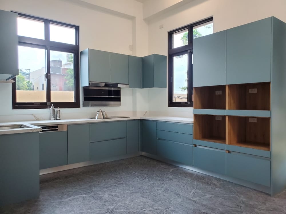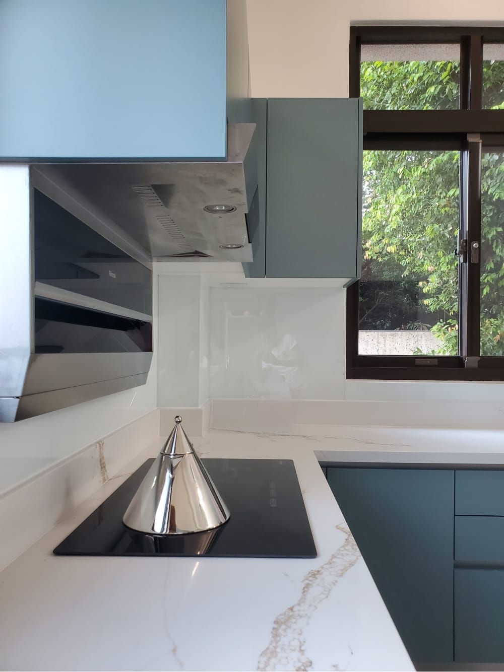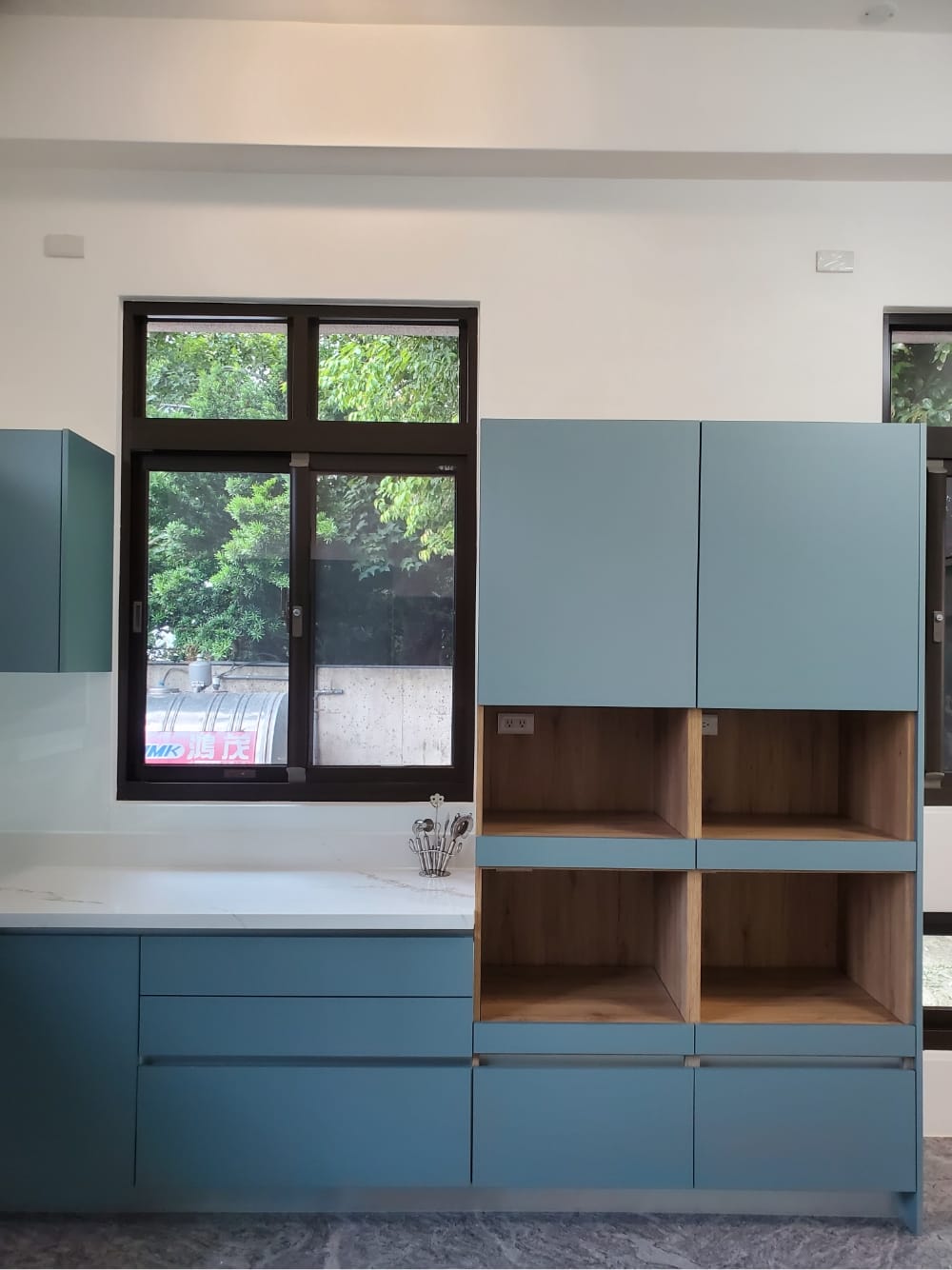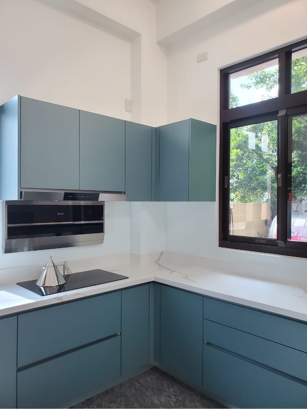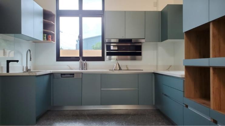 當陽光照射進來,霧面寶石藍門板散發出柔和的光澤,讓整體氛圍更加迷人、舒適,彷彿每一個角落都在敘述「放鬆、享受」的光陰故事。這樣的廚房不僅是烹飪的地方,更像是一個讓人放慢腳步、沉浸其中的美麗空間。