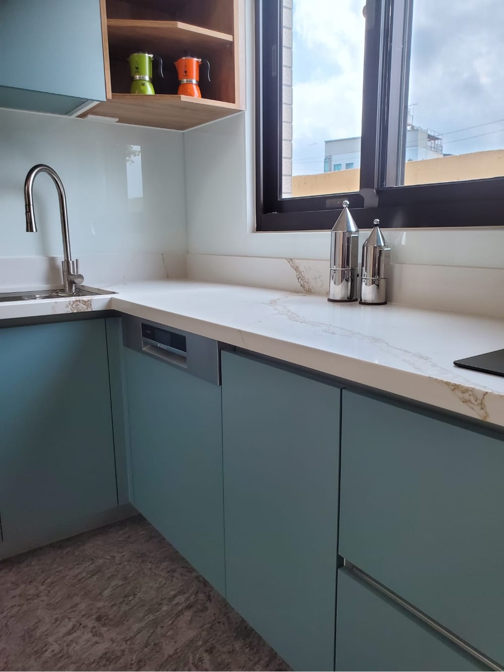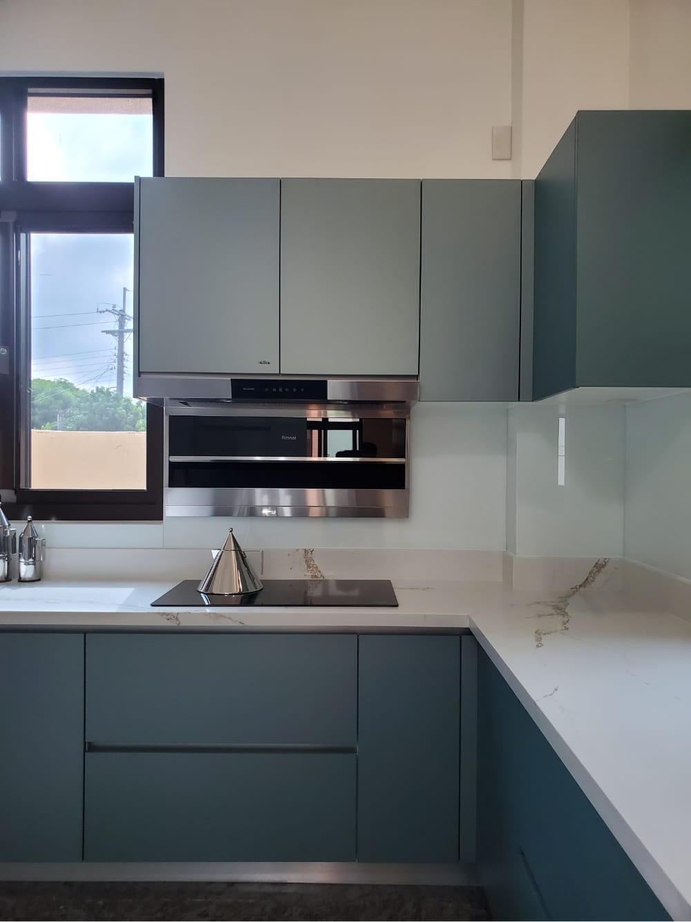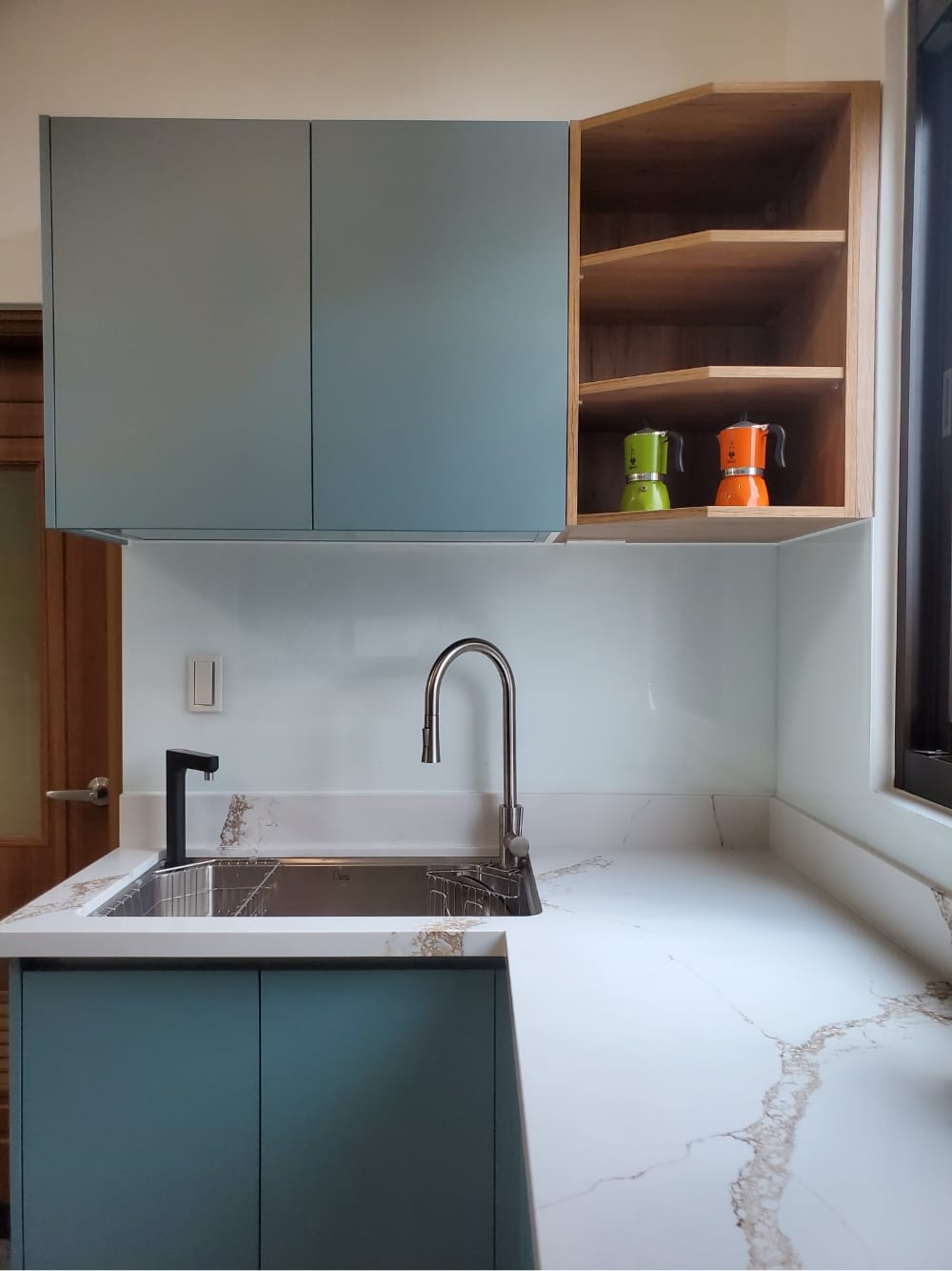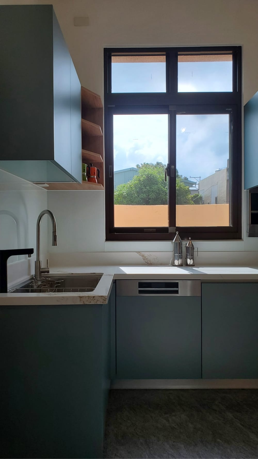 當陽光照射進來,霧面寶石藍門板散發出柔和的光澤,讓整體氛圍更加迷人、舒適,彷彿每一個角落都在敘述「放鬆、享受」的光陰故事。這樣的廚房不僅是烹飪的地方,更像是一個讓人放慢腳步、沉浸其中的美麗空間。