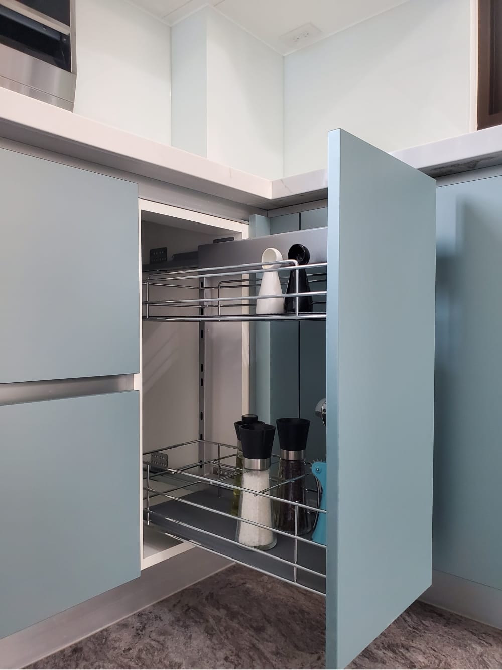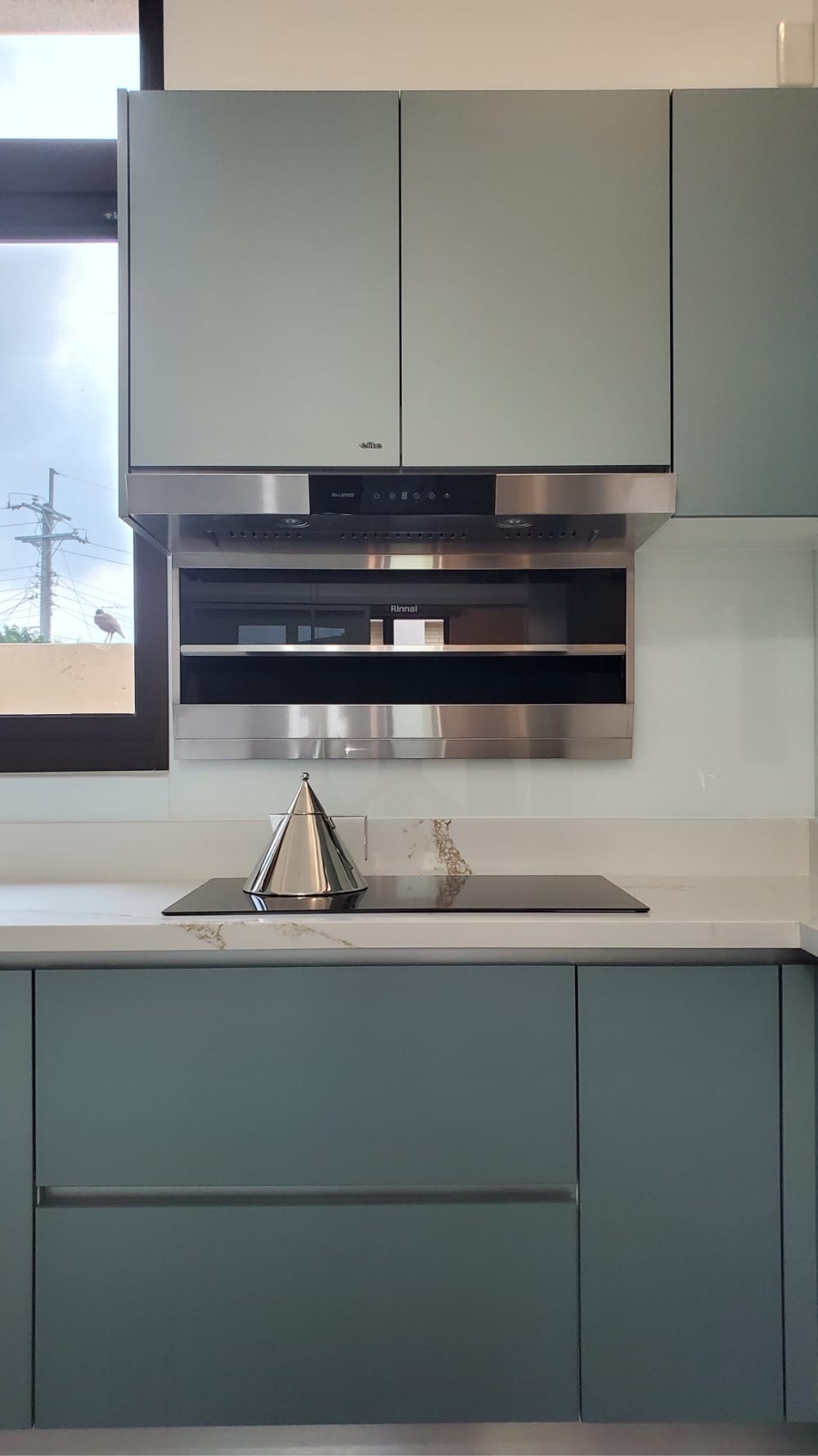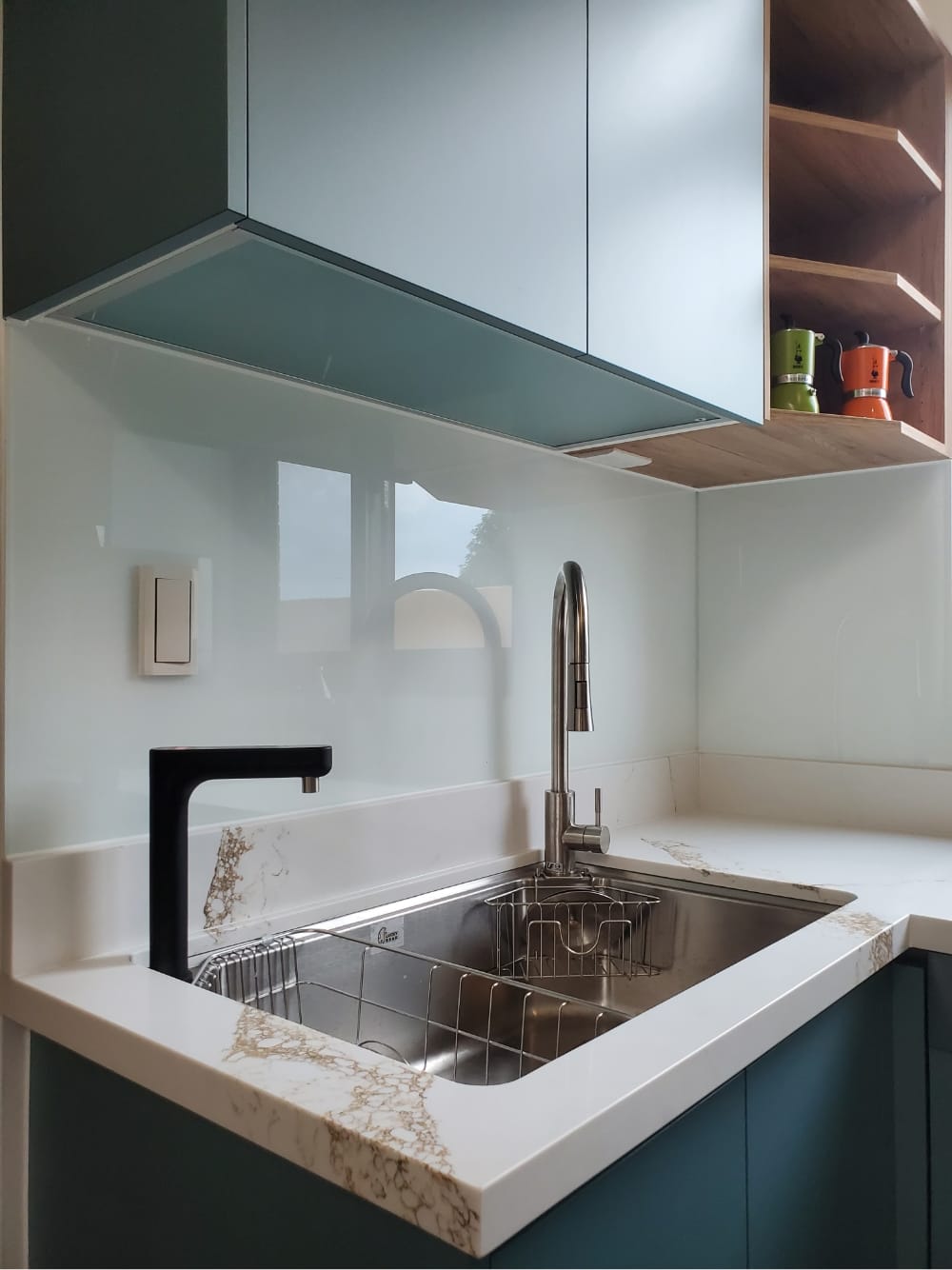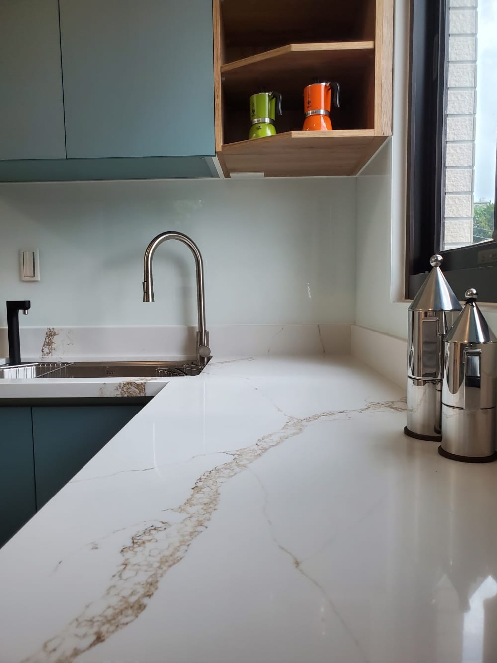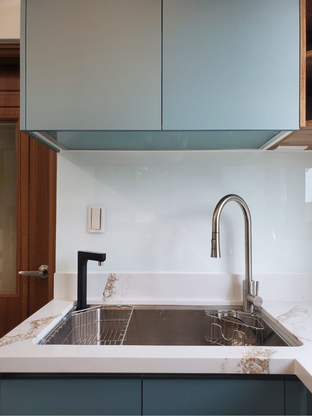 當陽光照射進來,霧面寶石藍門板散發出柔和的光澤,讓整體氛圍更加迷人、舒適,彷彿每一個角落都在敘述「放鬆、享受」的光陰故事。這樣的廚房不僅是烹飪的地方,更像是一個讓人放慢腳步、沉浸其中的美麗空間。