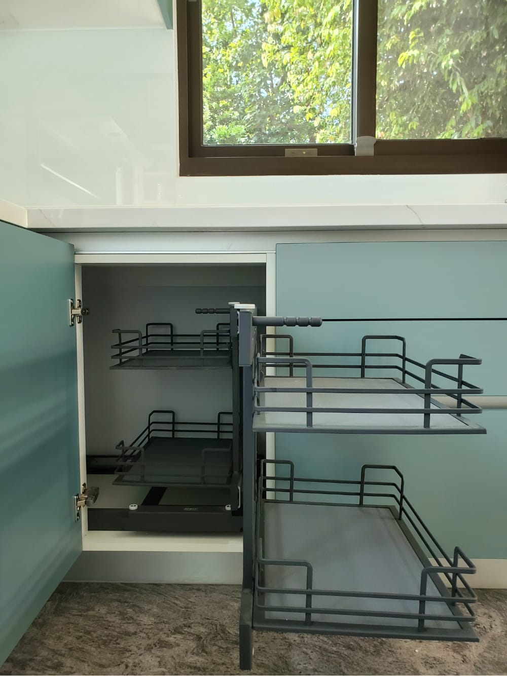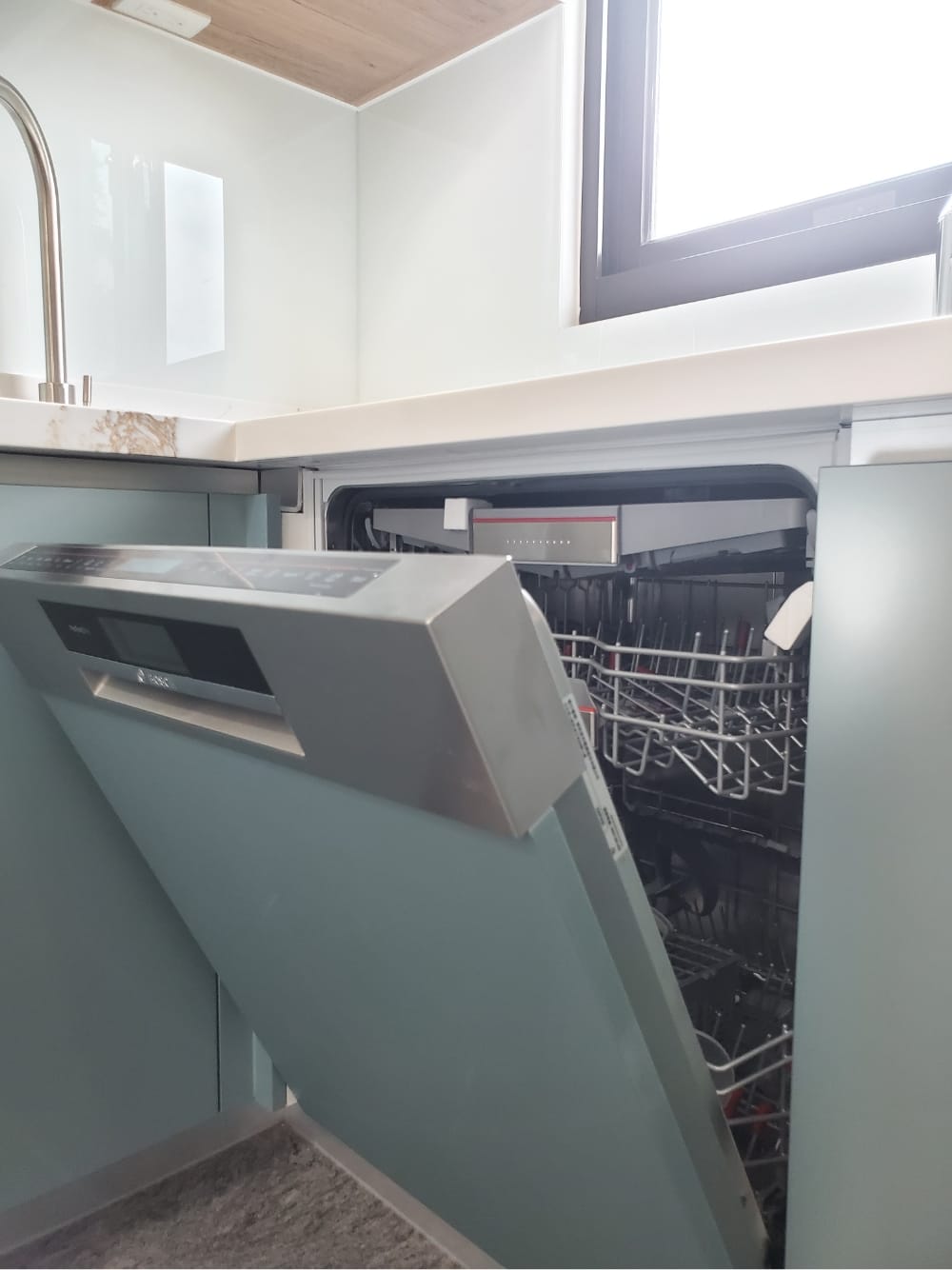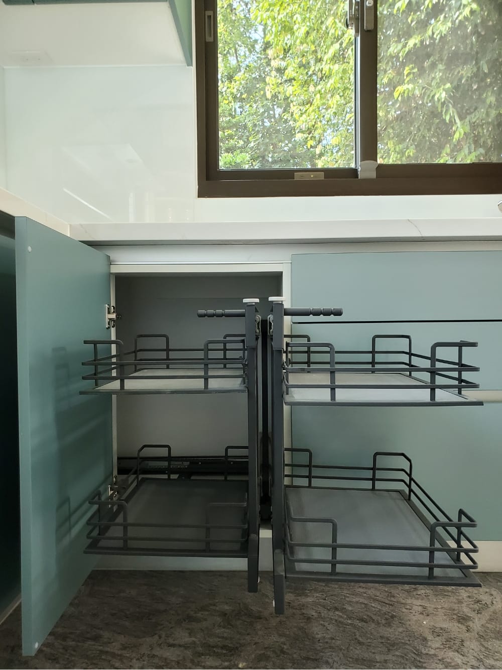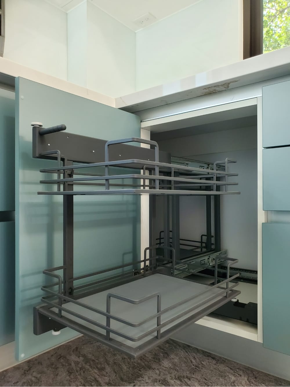 當陽光照射進來,霧面寶石藍門板散發出柔和的光澤,讓整體氛圍更加迷人、舒適,彷彿每一個角落都在敘述「放鬆、享受」的光陰故事。這樣的廚房不僅是烹飪的地方,更像是一個讓人放慢腳步、沉浸其中的美麗空間。