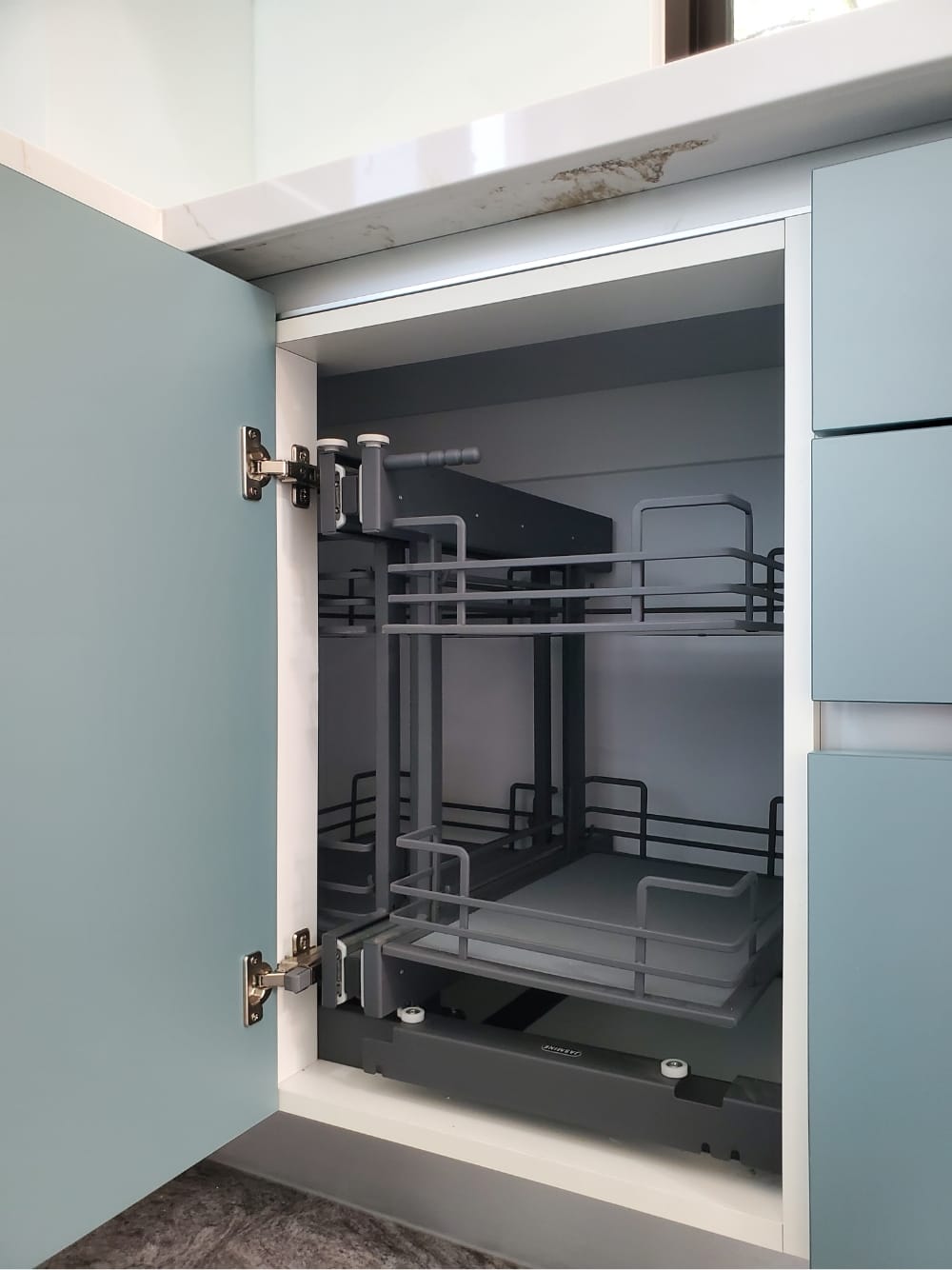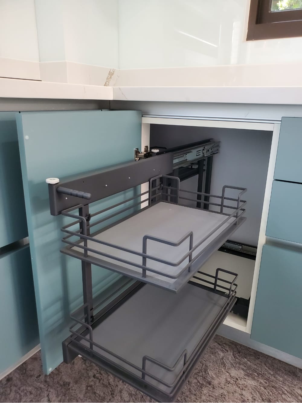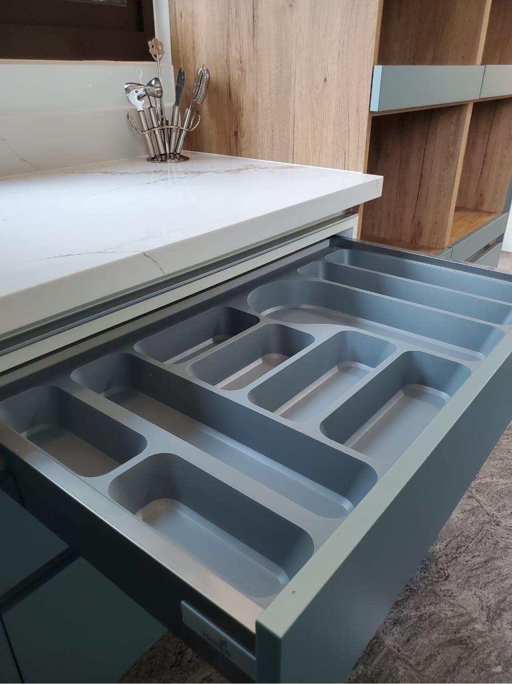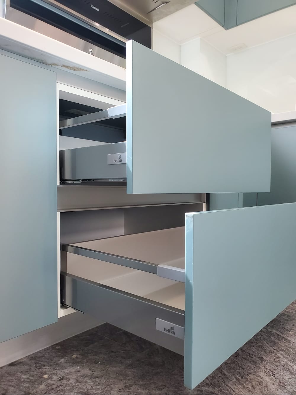 當陽光照射進來,霧面寶石藍門板散發出柔和的光澤,讓整體氛圍更加迷人、舒適,彷彿每一個角落都在敘述「放鬆、享受」的光陰故事。這樣的廚房不僅是烹飪的地方,更像是一個讓人放慢腳步、沉浸其中的美麗空間。
