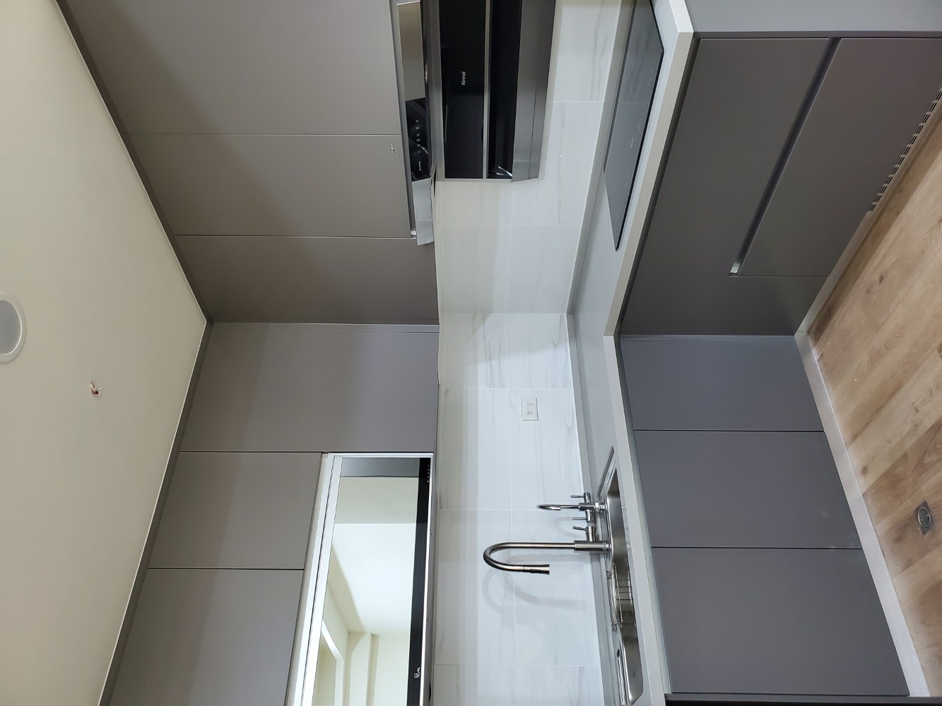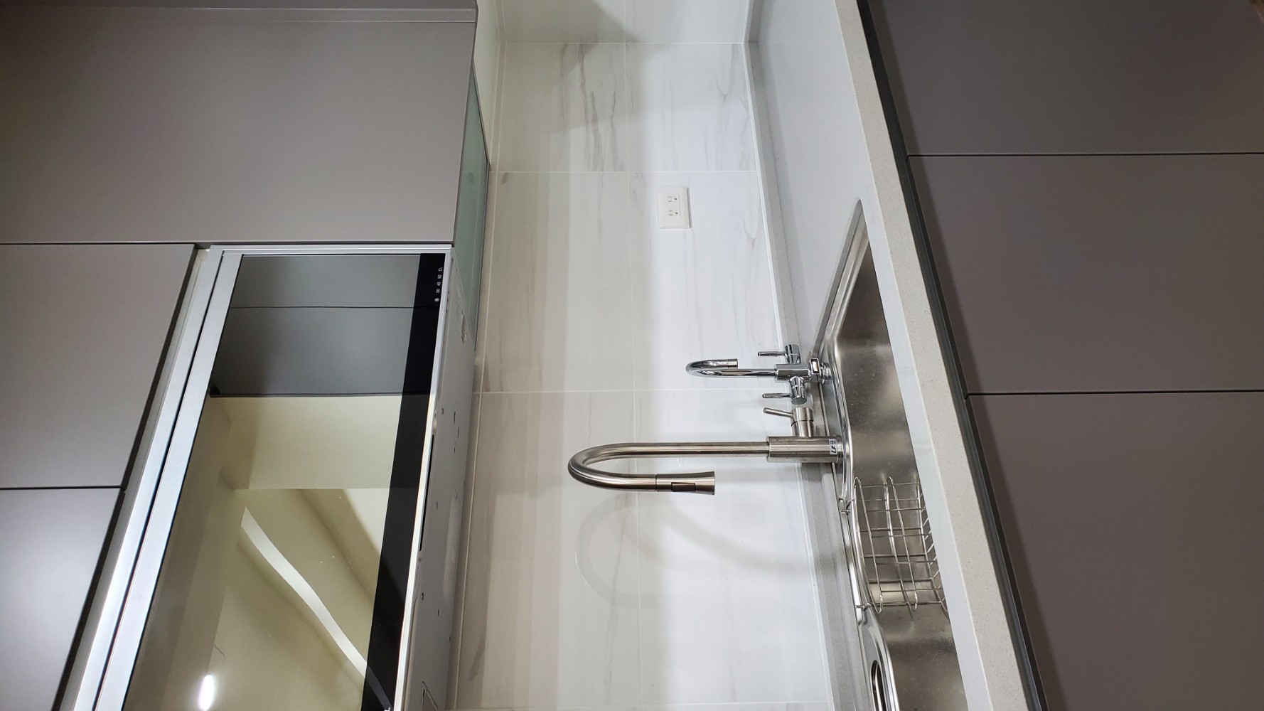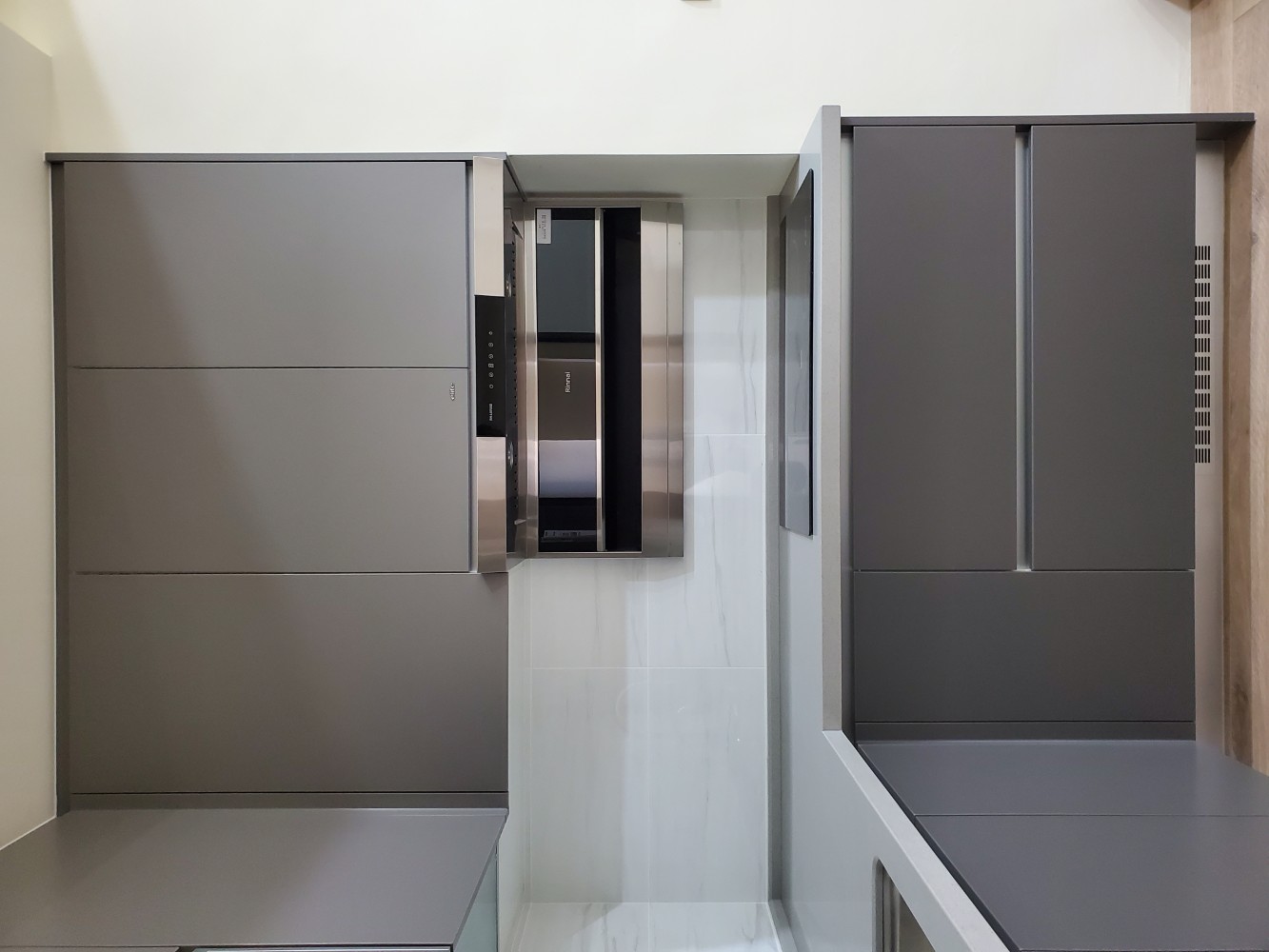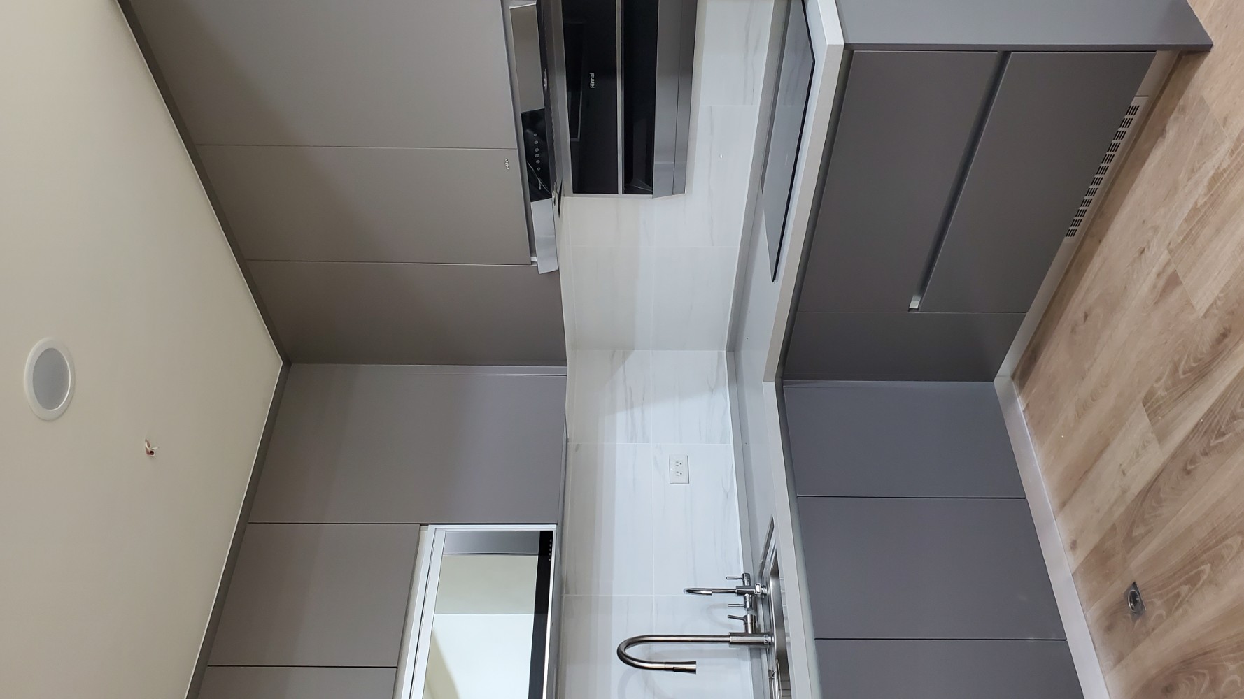 每一個細節都經過精心規劃,讓整個廚房看起來整齊有序,充滿簡約之美。檯面白色的潔淨感,與灰色門板的沉穩色調相互呼應,讓空間不顯擁擠,反而顯得寬廣。充分滿足日常烹飪所需,無論是設計還是使用,都展現出簡單、實用的理念。