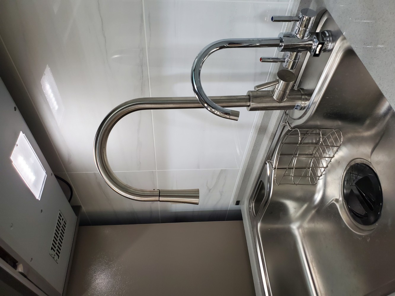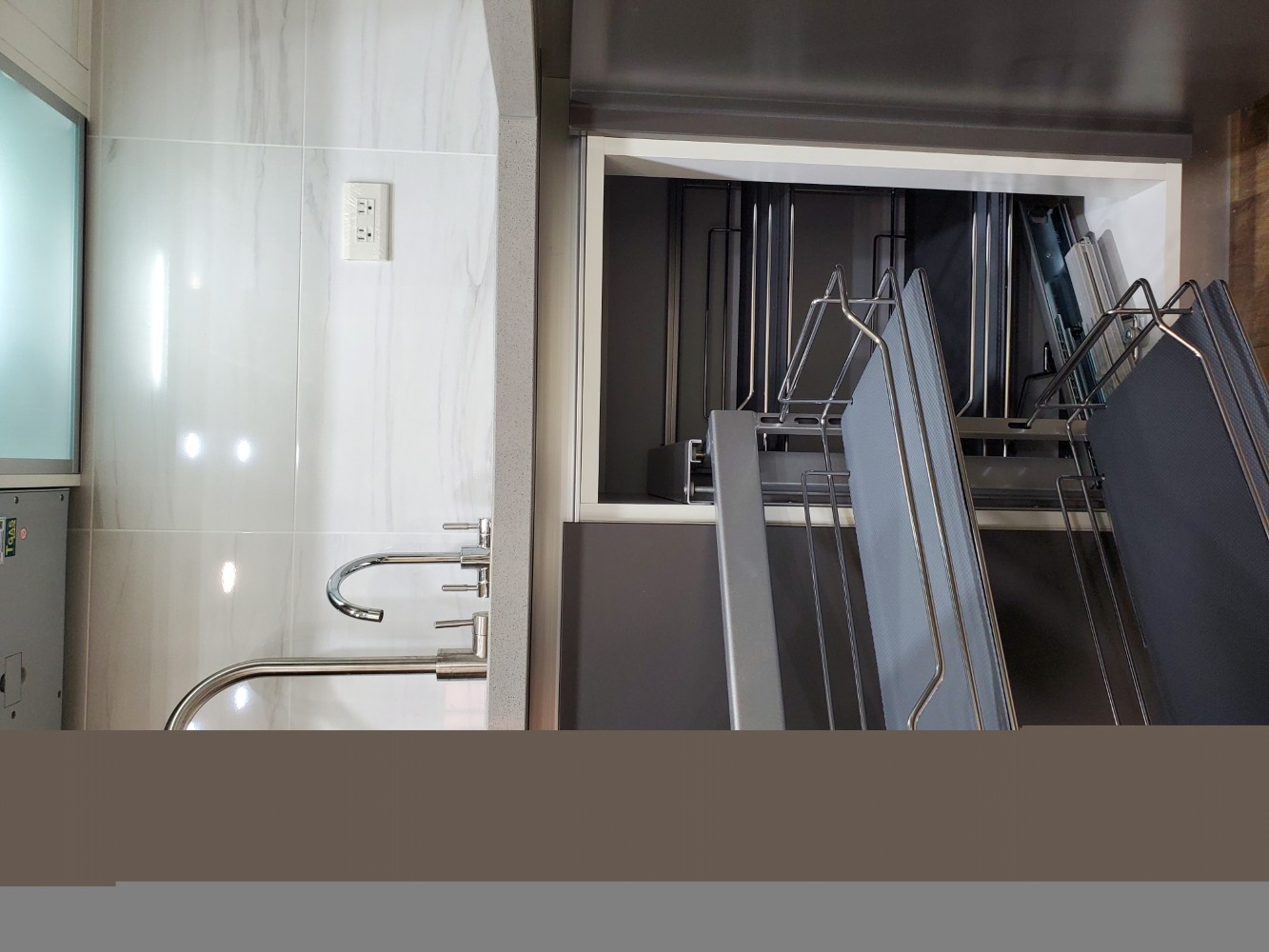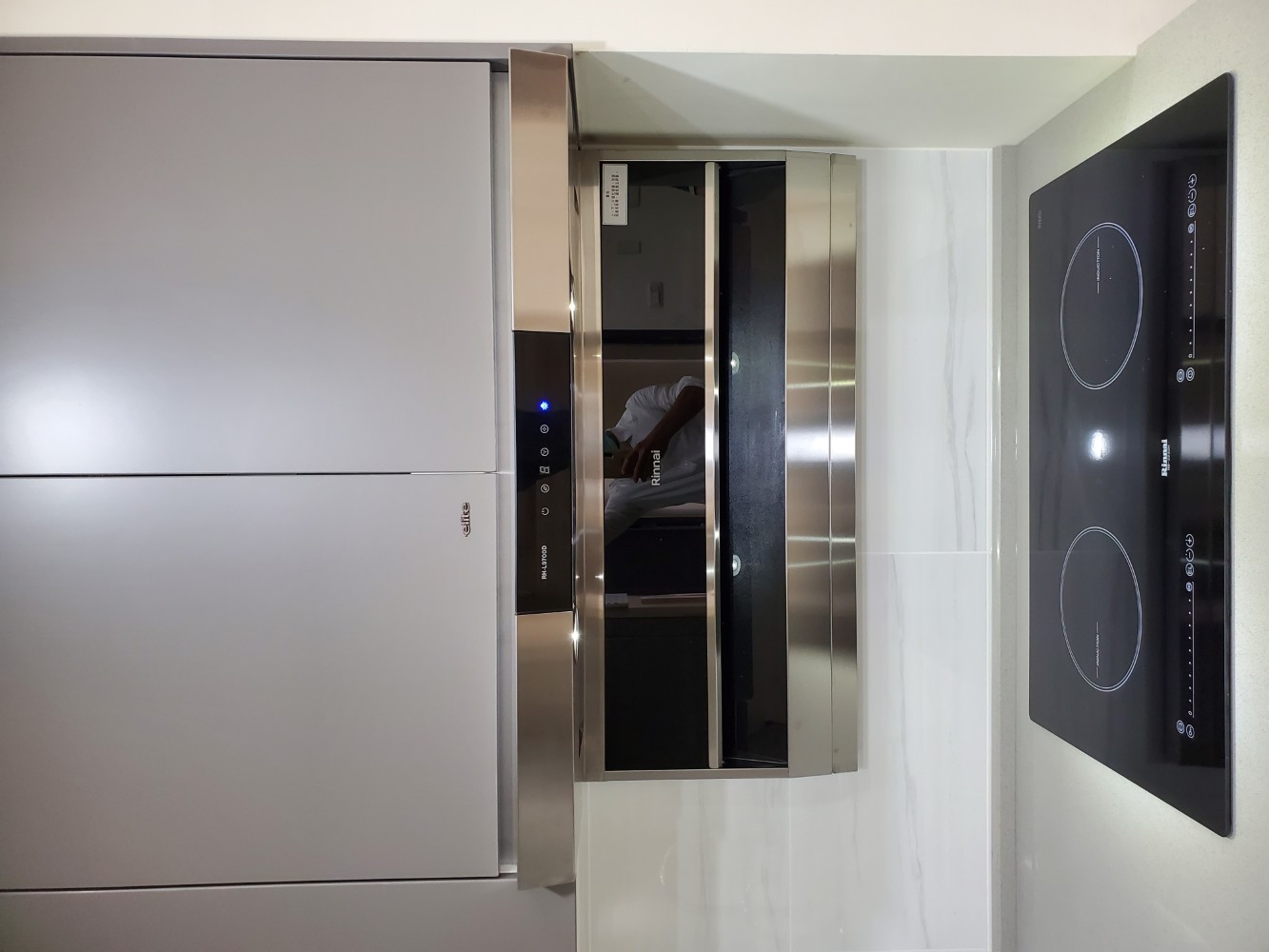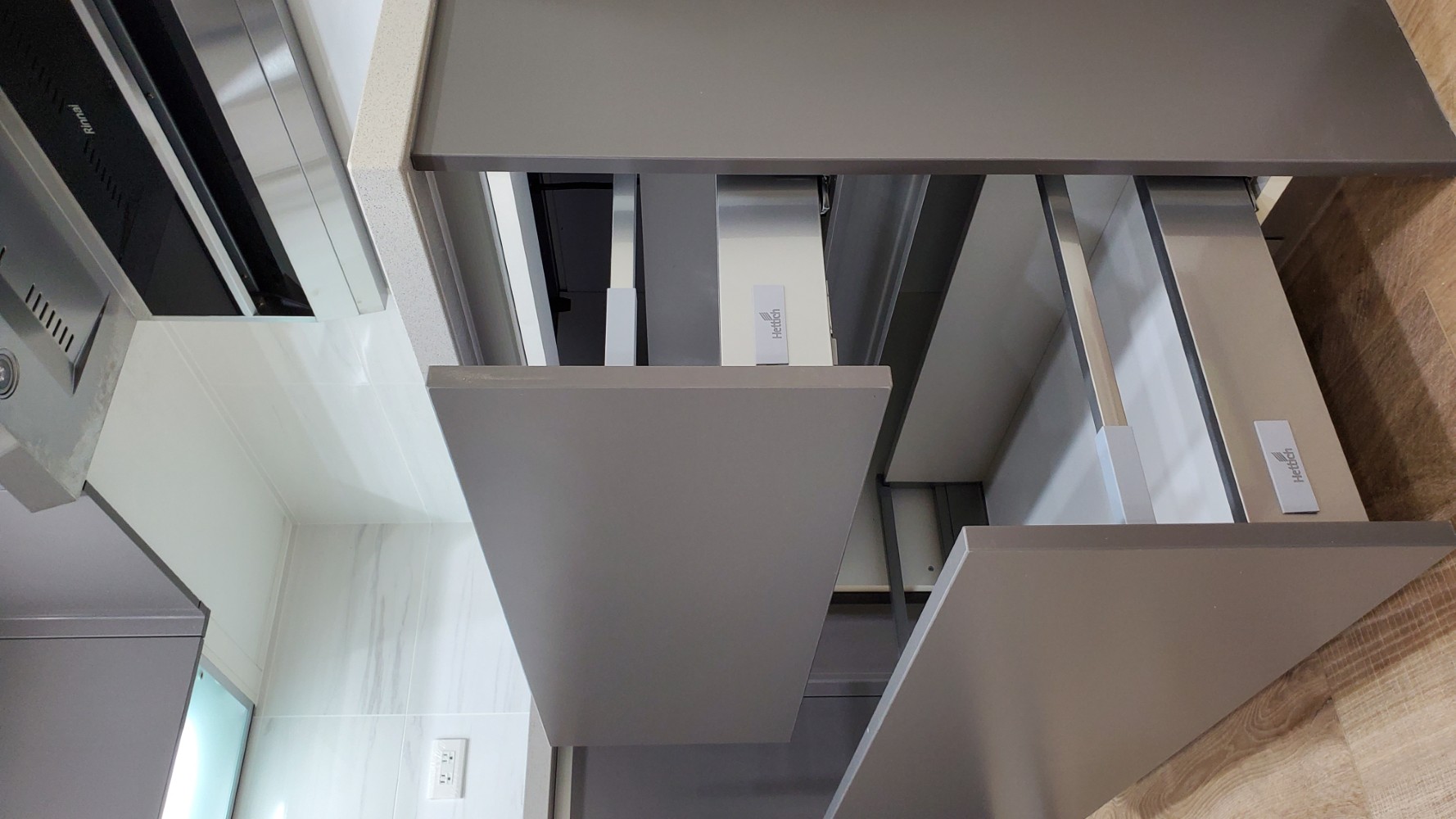 每一個細節都經過精心規劃,讓整個廚房看起來整齊有序,充滿簡約之美。檯面白色的潔淨感,與灰色門板的沉穩色調相互呼應,讓空間不顯擁擠,反而顯得寬廣。充分滿足日常烹飪所需,無論是設計還是使用,都展現出簡單、實用的理念。