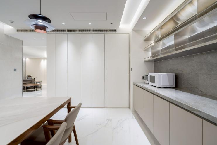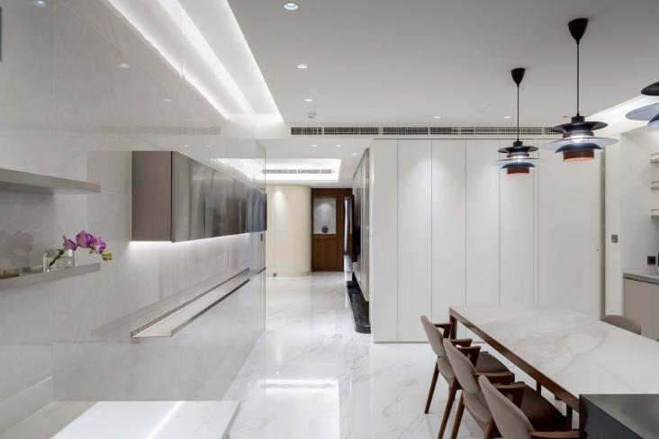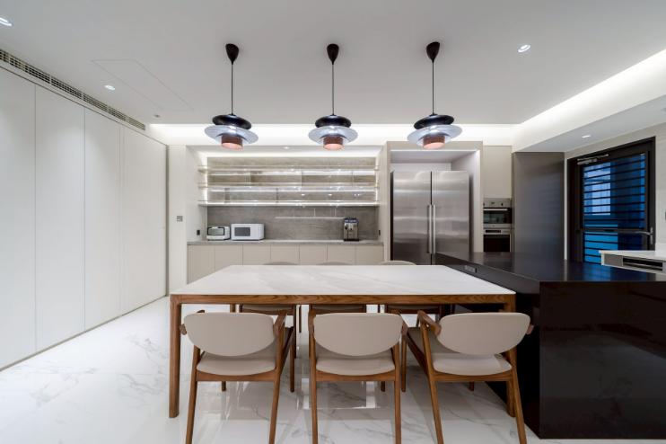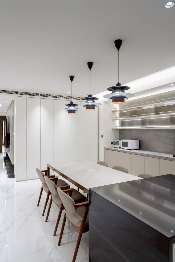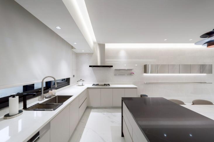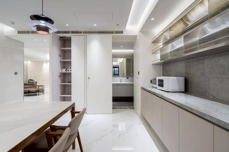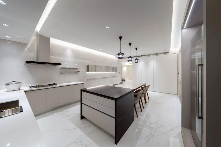 本案以明亮極簡為核心語彙,透過餐桌與中島的配置,建立清晰動線,串聯用餐與烹飪場域,形塑流暢且直覺的使用體驗。白色檯面結合台面爐、倒T抽油煙機與嵌門式洗碗機,機能完整且整體一致;中島以深色檯面形成視覺對比,提升空間層次。牆面採淺色光滑材質搭配金屬吊櫃與線性燈帶,延伸現代感語彙,並與白色地坪相互呼應。整體透過嵌燈與間接光源鋪陳,營造均勻柔和的光環境,展現潔淨、舒適且高度整合的生活場景。