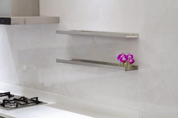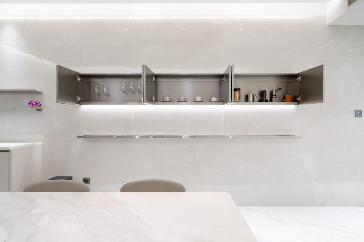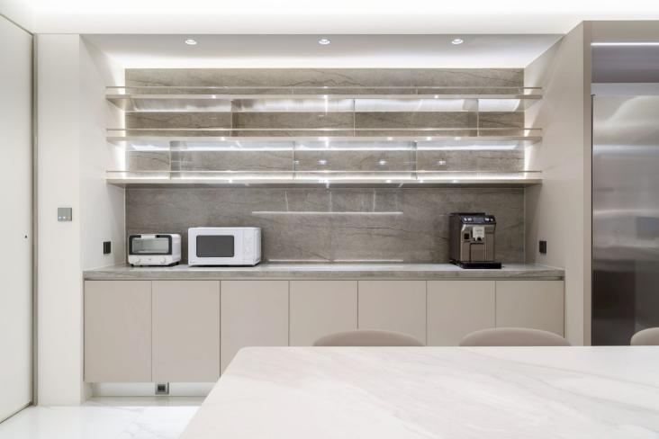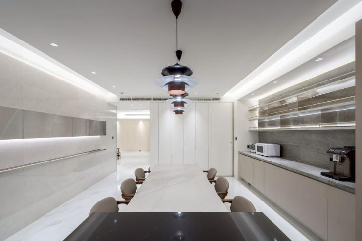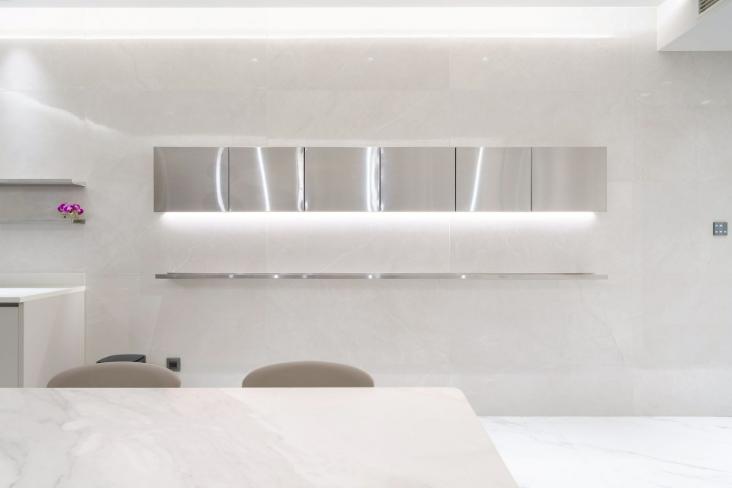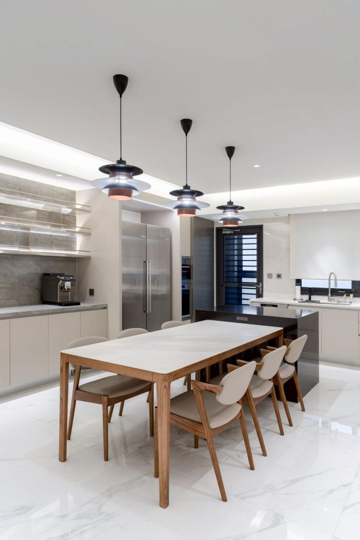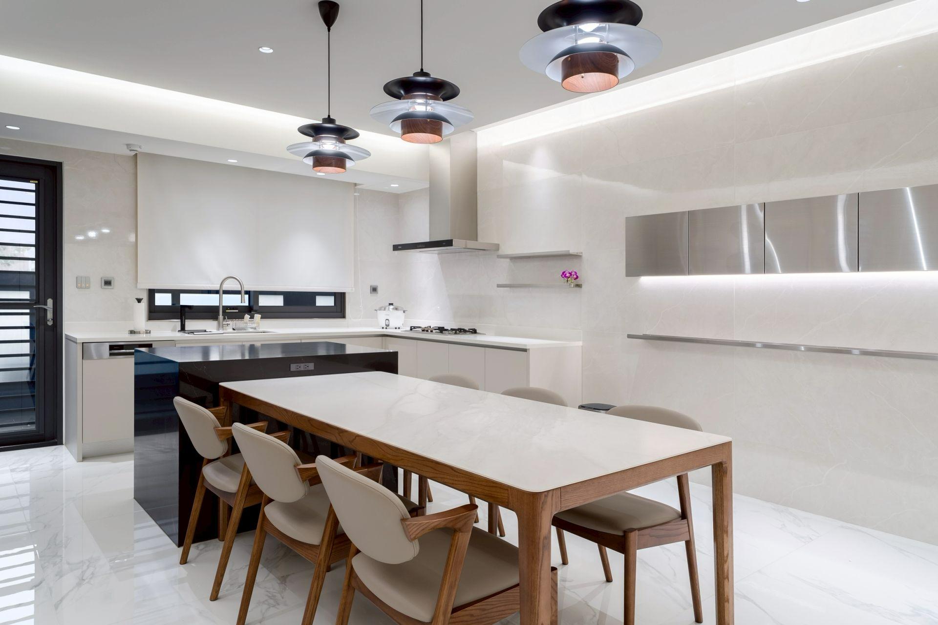 本案以明亮極簡為核心語彙,透過餐桌與中島的配置,建立清晰動線,串聯用餐與烹飪場域,形塑流暢且直覺的使用體驗。白色檯面結合台面爐、倒T抽油煙機與嵌門式洗碗機,機能完整且整體一致;中島以深色檯面形成視覺對比,提升空間層次。牆面採淺色光滑材質搭配金屬吊櫃與線性燈帶,延伸現代感語彙,並與白色地坪相互呼應。整體透過嵌燈與間接光源鋪陳,營造均勻柔和的光環境,展現潔淨、舒適且高度整合的生活場景。